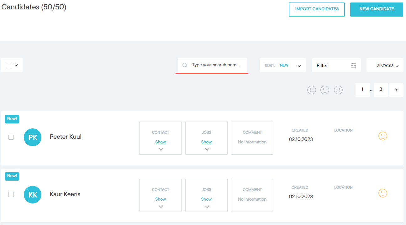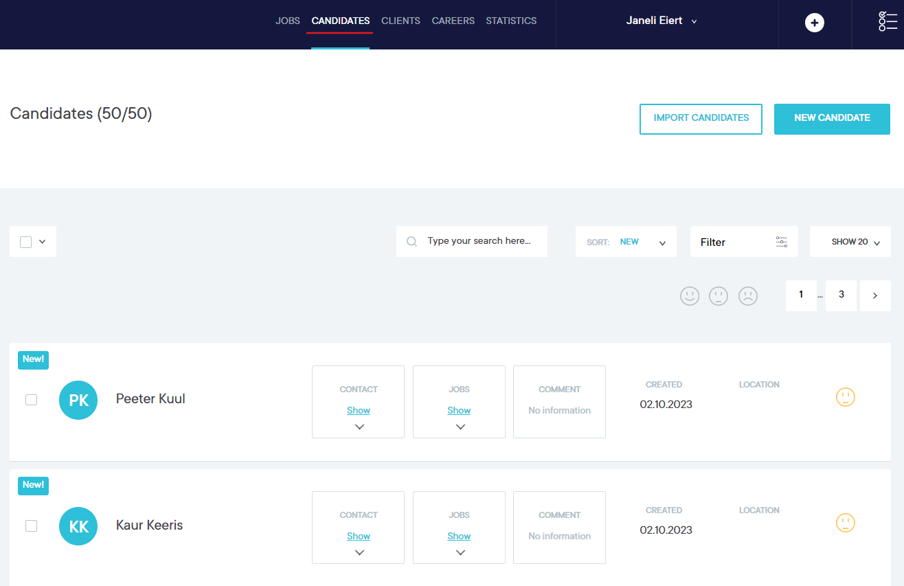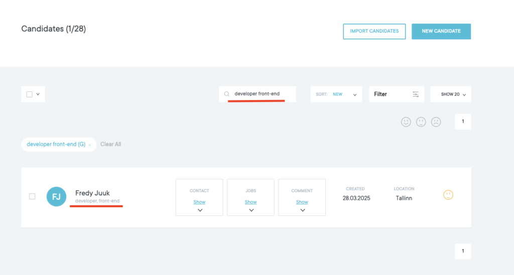 The search function is convenient to use when you want to locate a specific candidate or find a person from your candidate database who is suitable for a particular position. You can search by both the candidate’s name and various keywords. For example, you can search for individuals based on the information in their CV files, such as previous work experience, and more.
