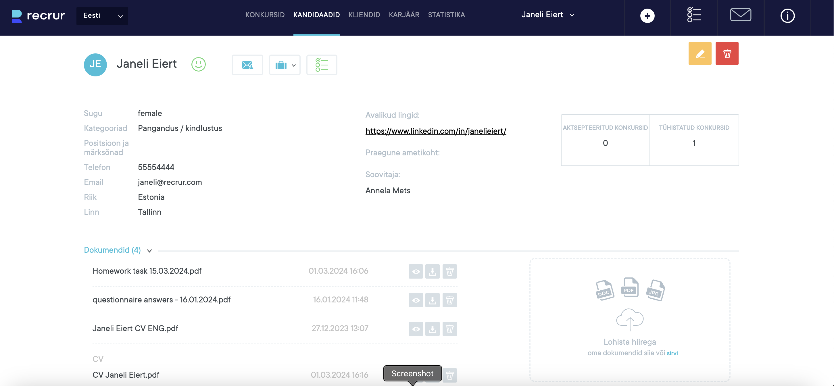 Dokumentide alla koondatakse kokku KÕIK kandidaadi poolt edastatud dokumentid kandideerimiste jooskul. Näiteks: kui kandidaat on kandideerimud kolmele positsioonile erinevate dokumentidega kuvatakse dokumentide all kõiki tema poolt edastatud faile. Paremal olevas väljas on võilaik lisada kandidaadi profiilile manuaalselt dokumente juurde.