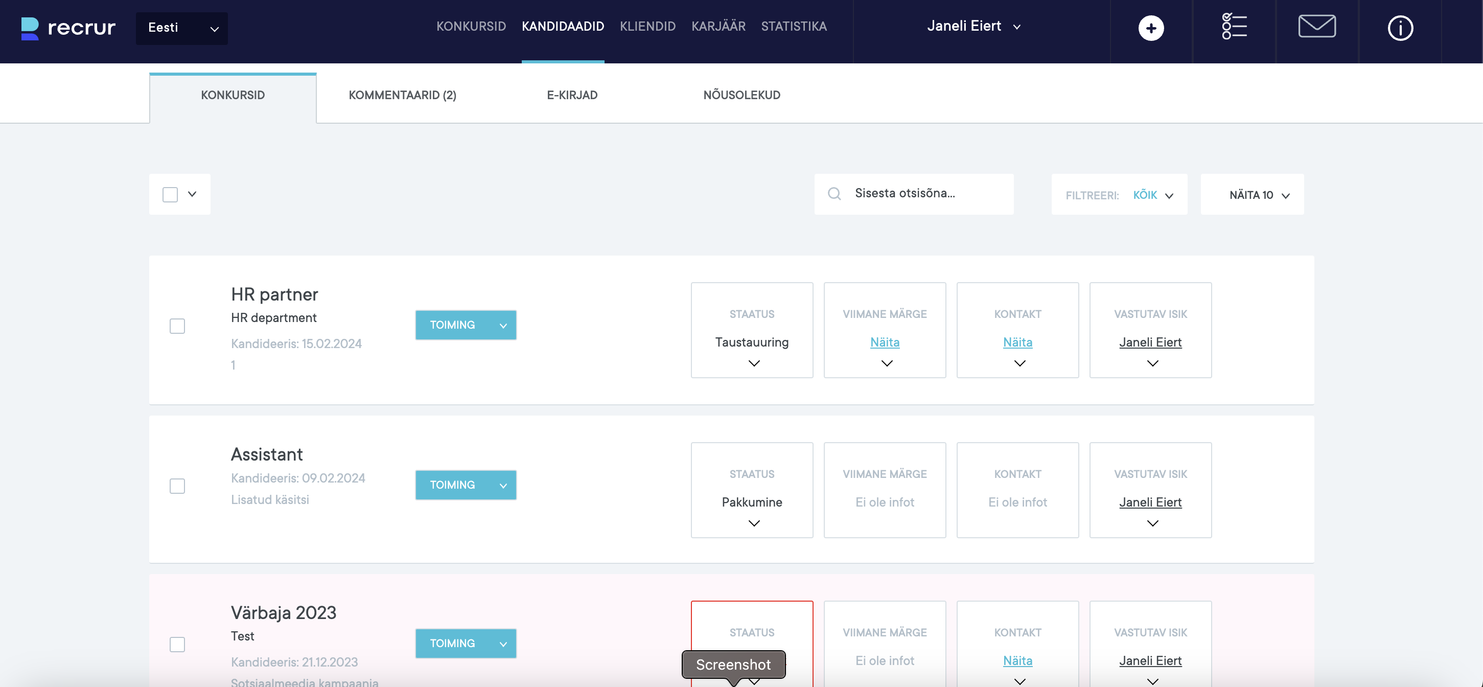 Kandidaadi nime kõrval oleva näo alusel saab teda üldiselt hinnata ja hiljen andmebaasist filtri alusel välja selekteerida. Ümbrikuga tähistatud väljalt on võimalik kandidaadile saata e-kiri, kohvri märgiga väljalt saab kandidaati lisada uuele konkursile käsitsi ning roheliste ringidega tähistatud väljalt saab kandidaadiga seotuna saata kolleegile kas ülesanne või kohtumise kutse.