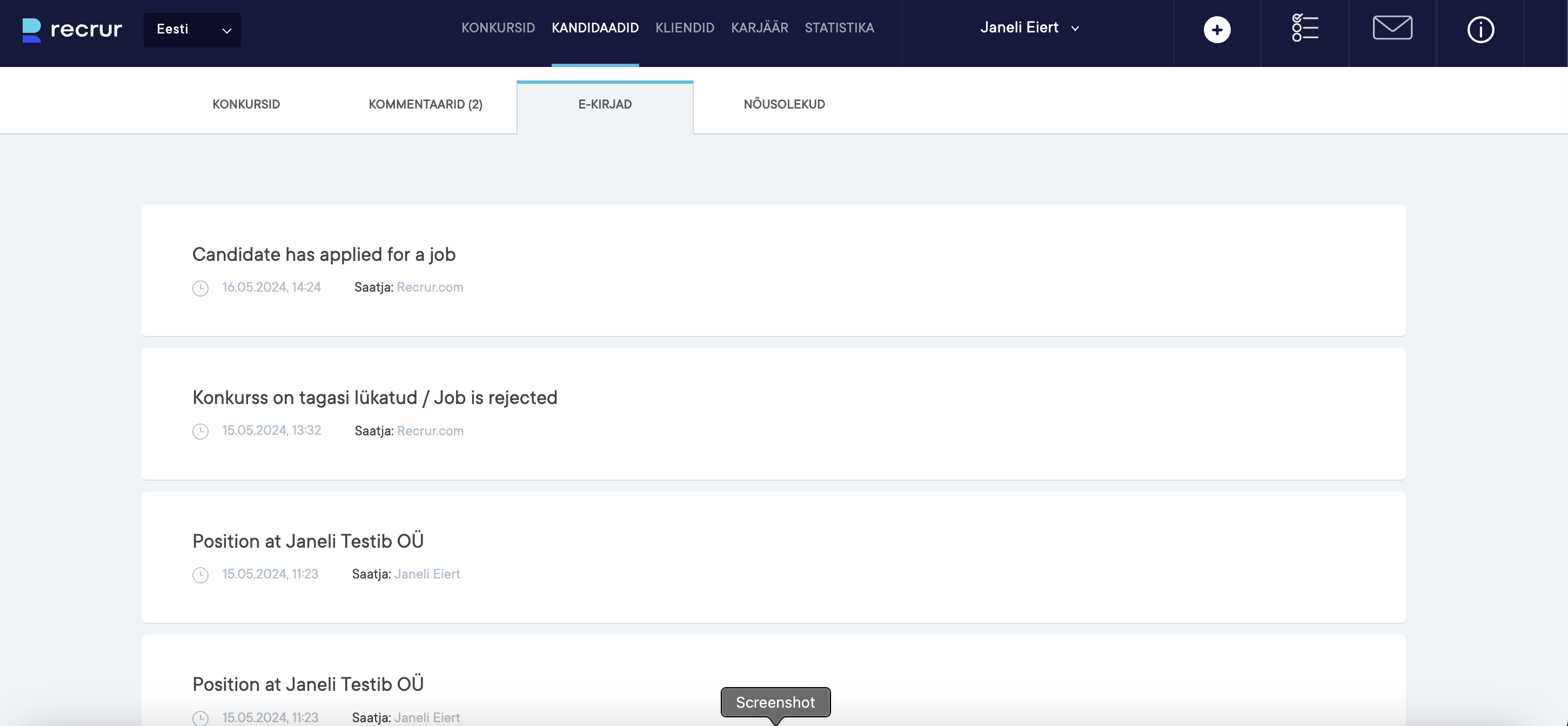 E-kirjad alt näeb kandidaadile Recrurist saadetud e-kirjade ajalugu: