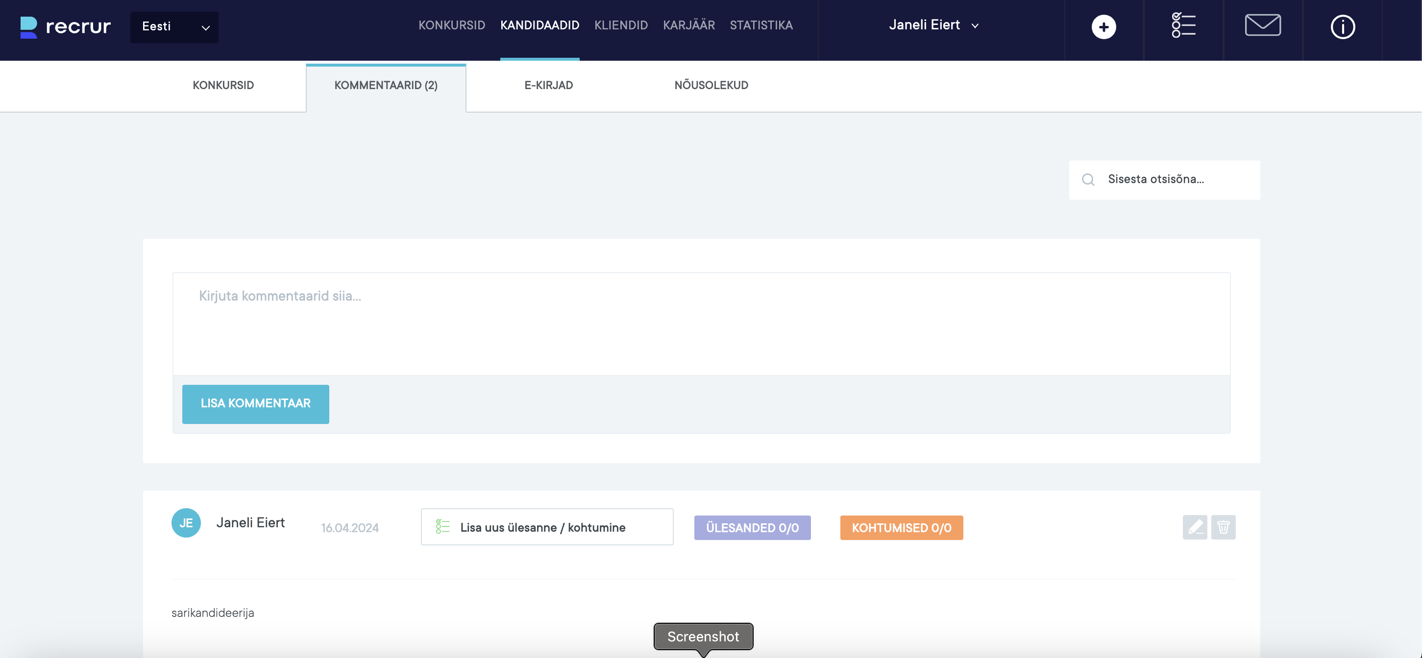 Kommentaaride lahtrisse saab lisada üldist kommentaari kandidaadi kohta. Sinna lisatud kommentaar on edaspidi nähtav konkursi all Viimane märge lahtris ja see kommentaar tuleb kandidaadiga kaasa automaatselt igal järgneval konkursil kuhu ta kandideerib.