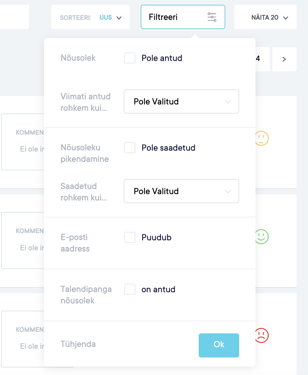 Filtreerimine annab võimaluse kandidaate nõusolekute järgi välja selekteerida: