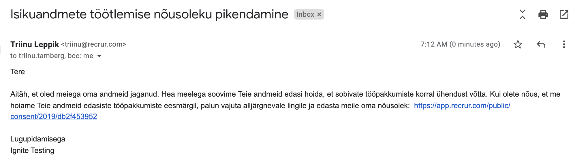 Kui kandidaadid on süsteemis olnud juba teatud aja (aeg sõltub teie organisatsioonisisestest vajadustest ja kokkulepetest), siis GDPR-i järgides tuleks nad süsteemist kas kustutada või küsida neilt nõusoleku (et nad on nõus, et teie nende andmeid hoiate) pikendamist.