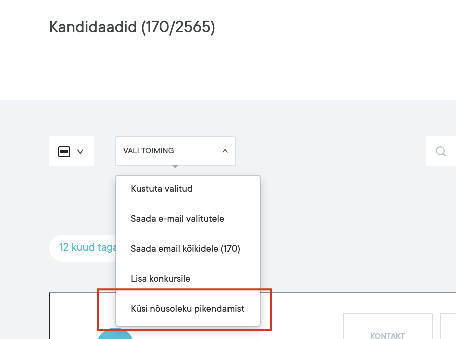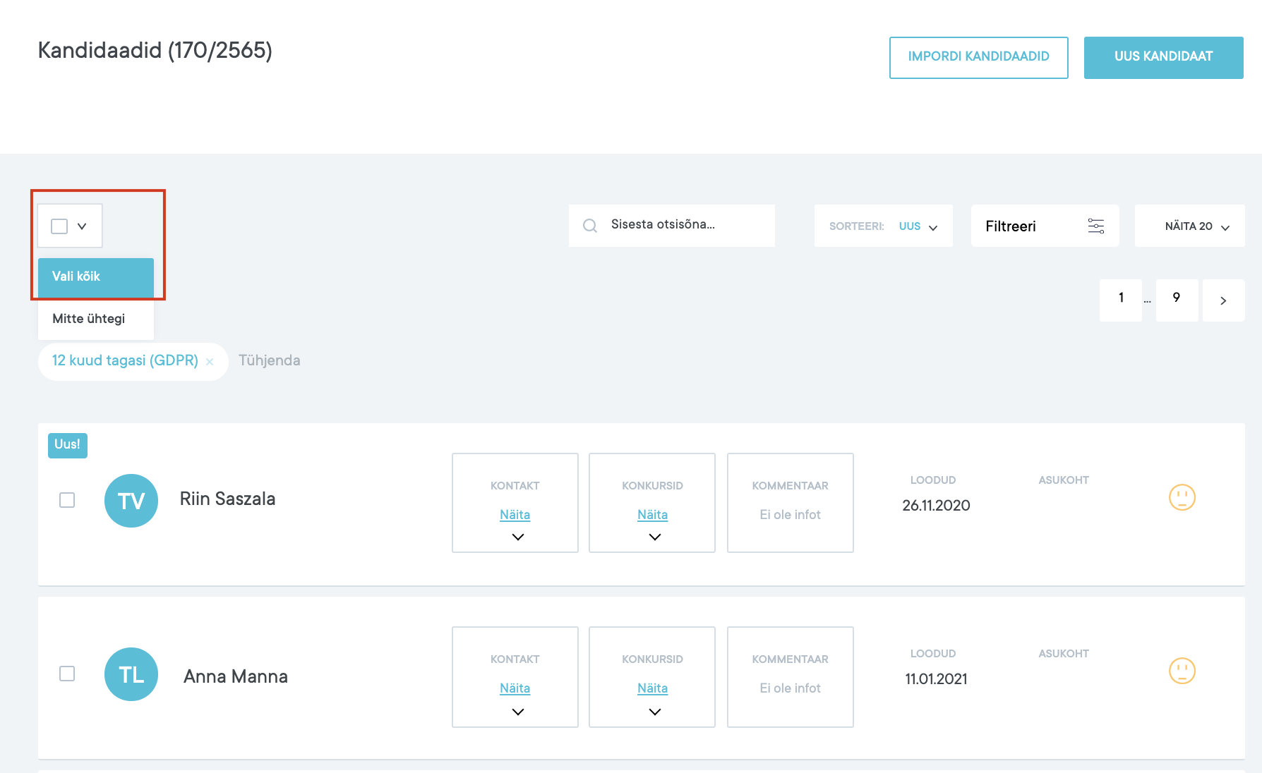 Kui vajutad (pärast filtrite lisamist!) siin nupule “Vali kõik” – siis valib süsteem kõik kandidaadid ning nendega saad edasi toimetada. Soovi korral võid ka käsitsi kõik kandidaadid ära märkida.