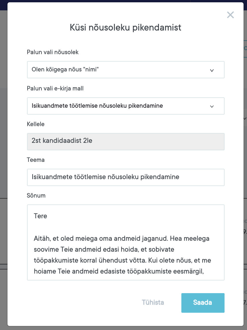 Kui kõik on valmis, vajuta nupule “Saada” – valitud kandidaadile/kandidaatidele saadetakse välja kiri nõusoleku pikendamisega. Kiri näeb välja näiteks selline: