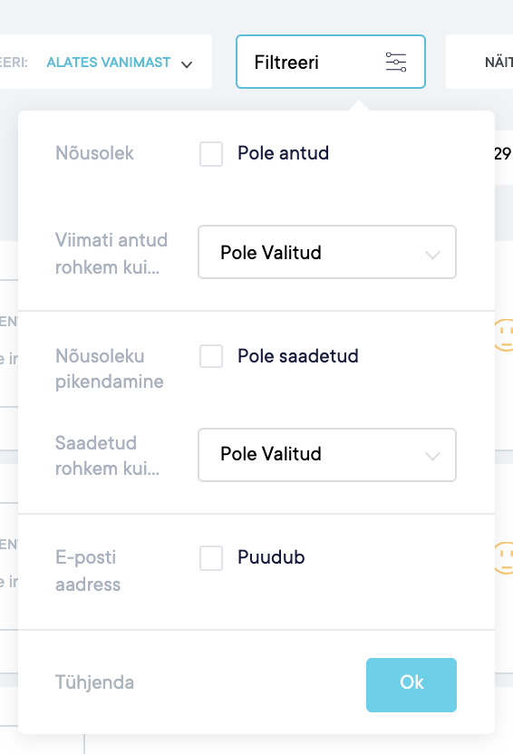 Nende kahe esimese filtriga saad Sa esmajoones kätte soovitud hulga kandidaate, kellelt nõusoleku pikendamist küsida (või nt keda soovid kohe süsteemist kustutada).