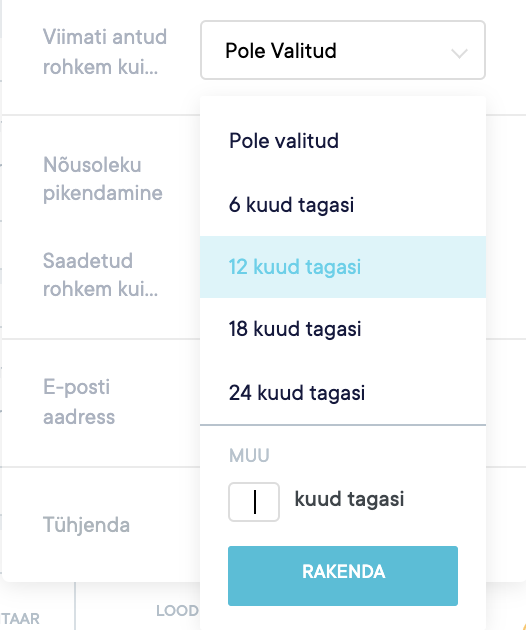 2. (Nõusolek) Viimati antud rohkem kui… X kuud tagasi – selliselt saab välja filtreerida kandidaadid, kes on andnud oma nõusoleku rohkem kui X kuud tagasi (kuude arvu saab valida või ise käsitsi määrata)