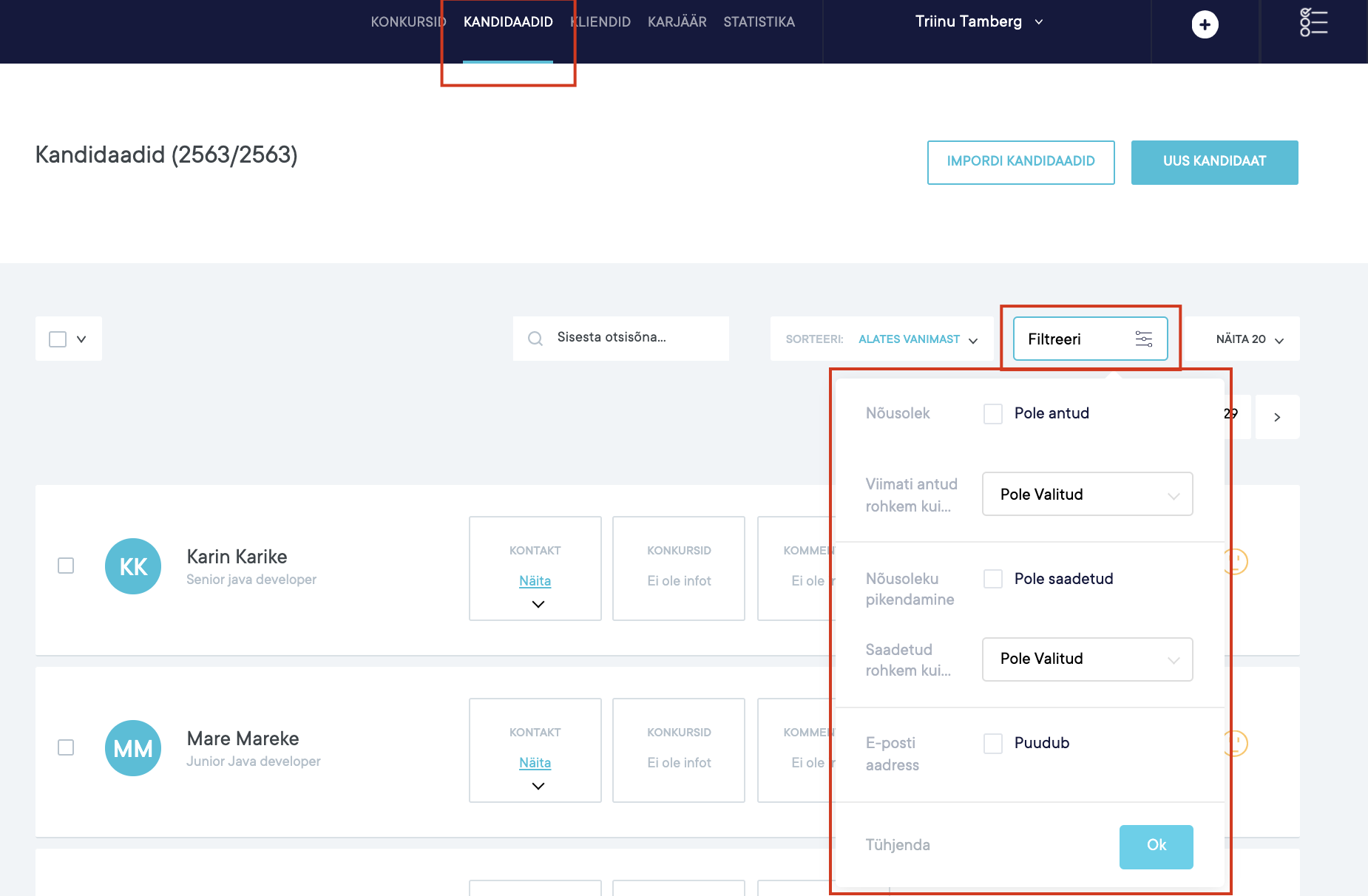 Niisiis tuleks saada teada, millised kandidaadid on süsteemis liiga kaua olnud (nt kauem kui 1 aasta). Selleks tuleb liikuda “Kandidaadid” vaatesse ning filtreerida välja teile vajalikele tingimustele vastavad kandidaadid: