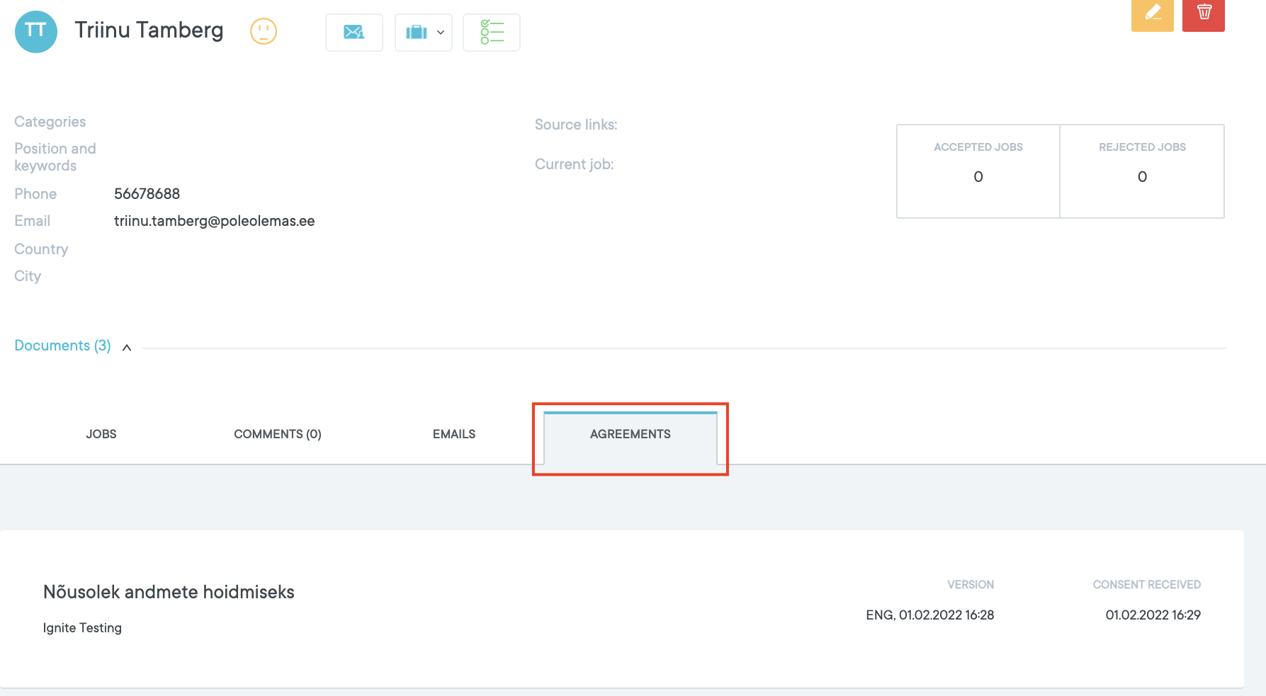 Kui kandidaat avab selle lingi, avaneb talle põhimõtteliselt sarnane vaade nagu kandideerimisvormil – ta peab sisestama enda ees- ja perekonnanime ja kontaktandmed. Kui ta selle esitab, siis tekib tema profiilile Recruris uus nõusolek: