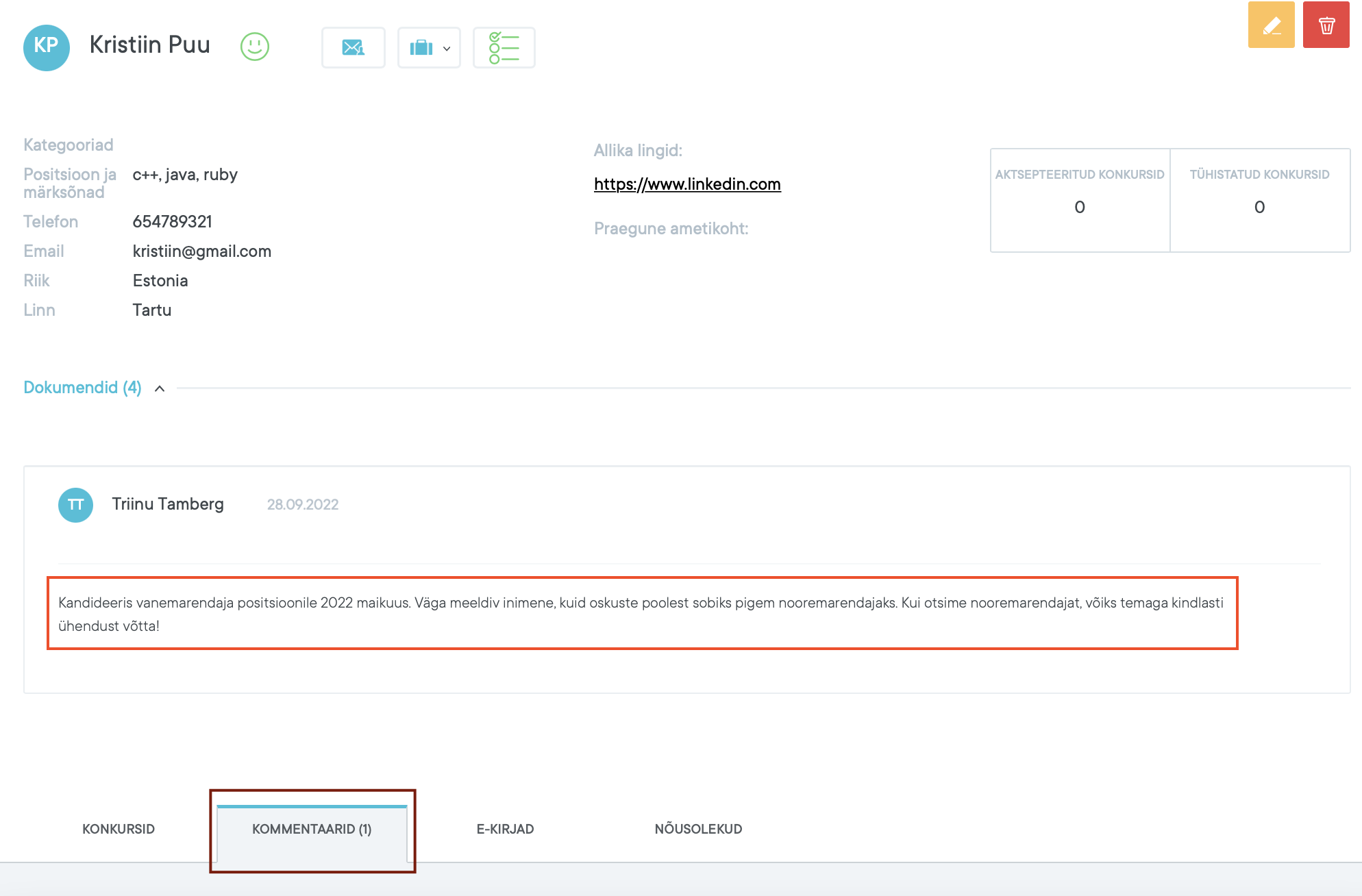 Selleks, et oleks võimalik kandidaadile anda tagasisidet ühe konkreetse konkursi raames, oleme lisanud tegevuste vaatesse (activity view) kommentaaride lisamise võimaluse.