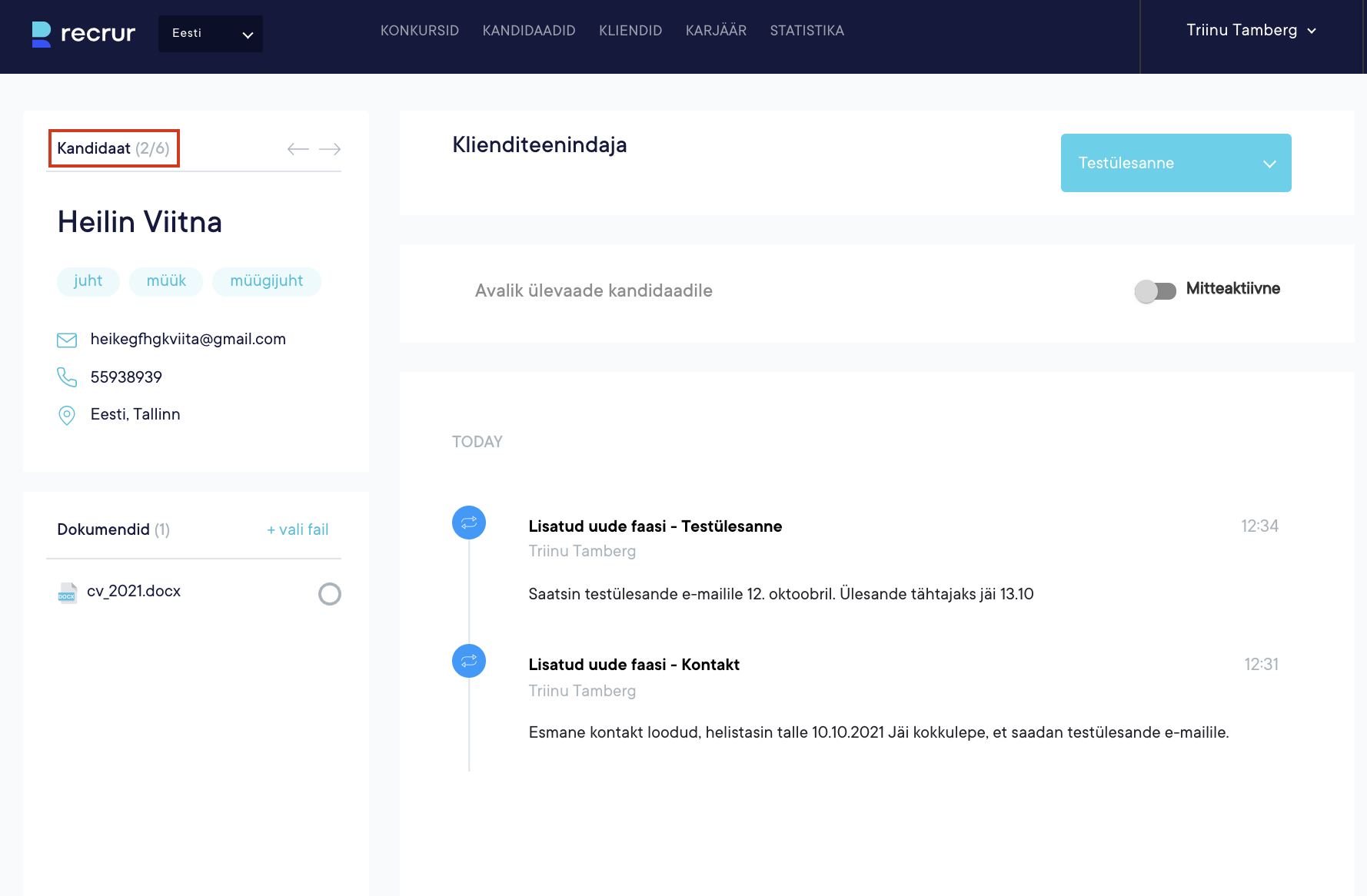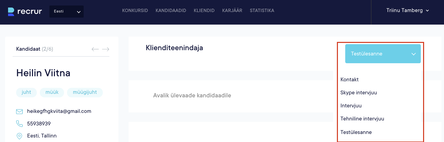 6. Näha, millises faasis kandidaat hetkel on ning kandidaadi faasi ka vahetada.