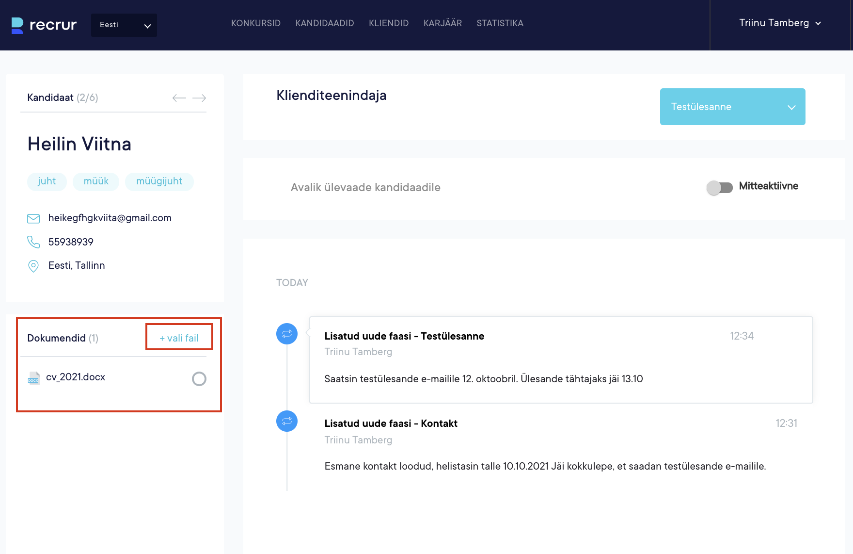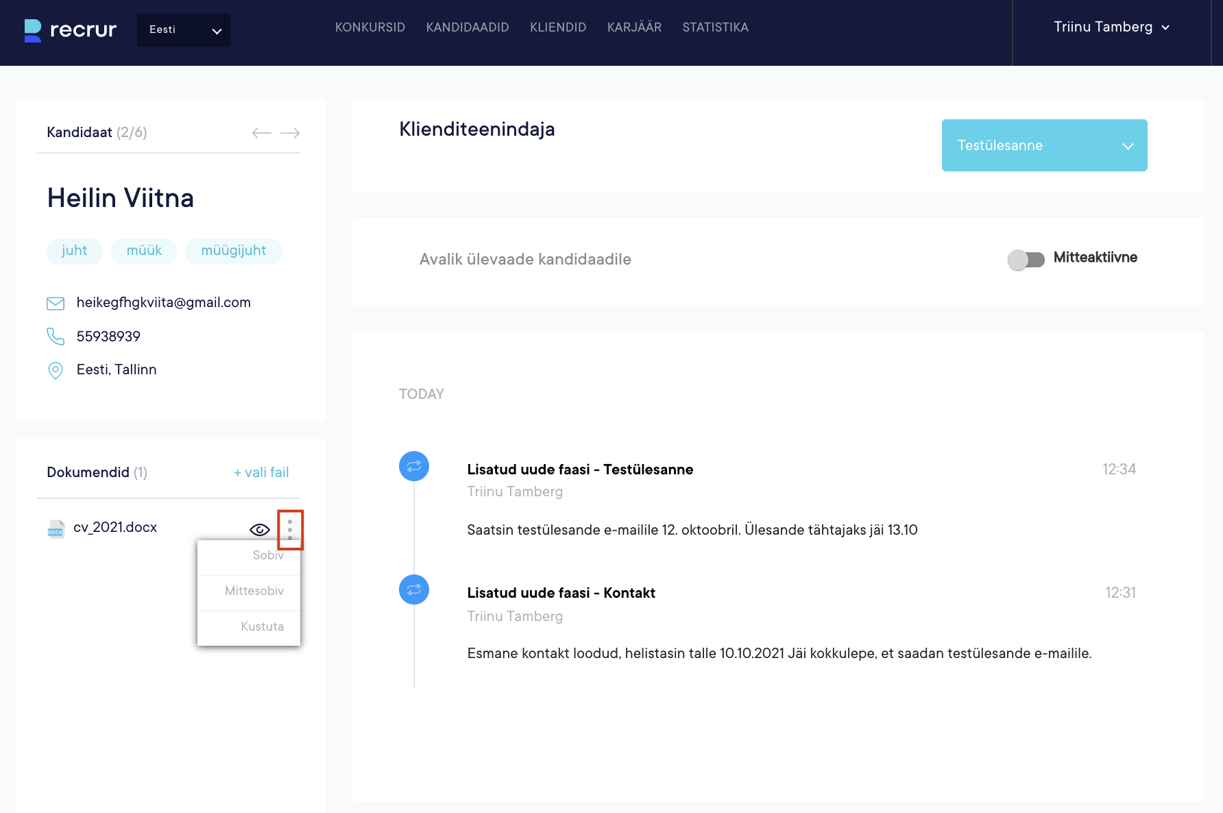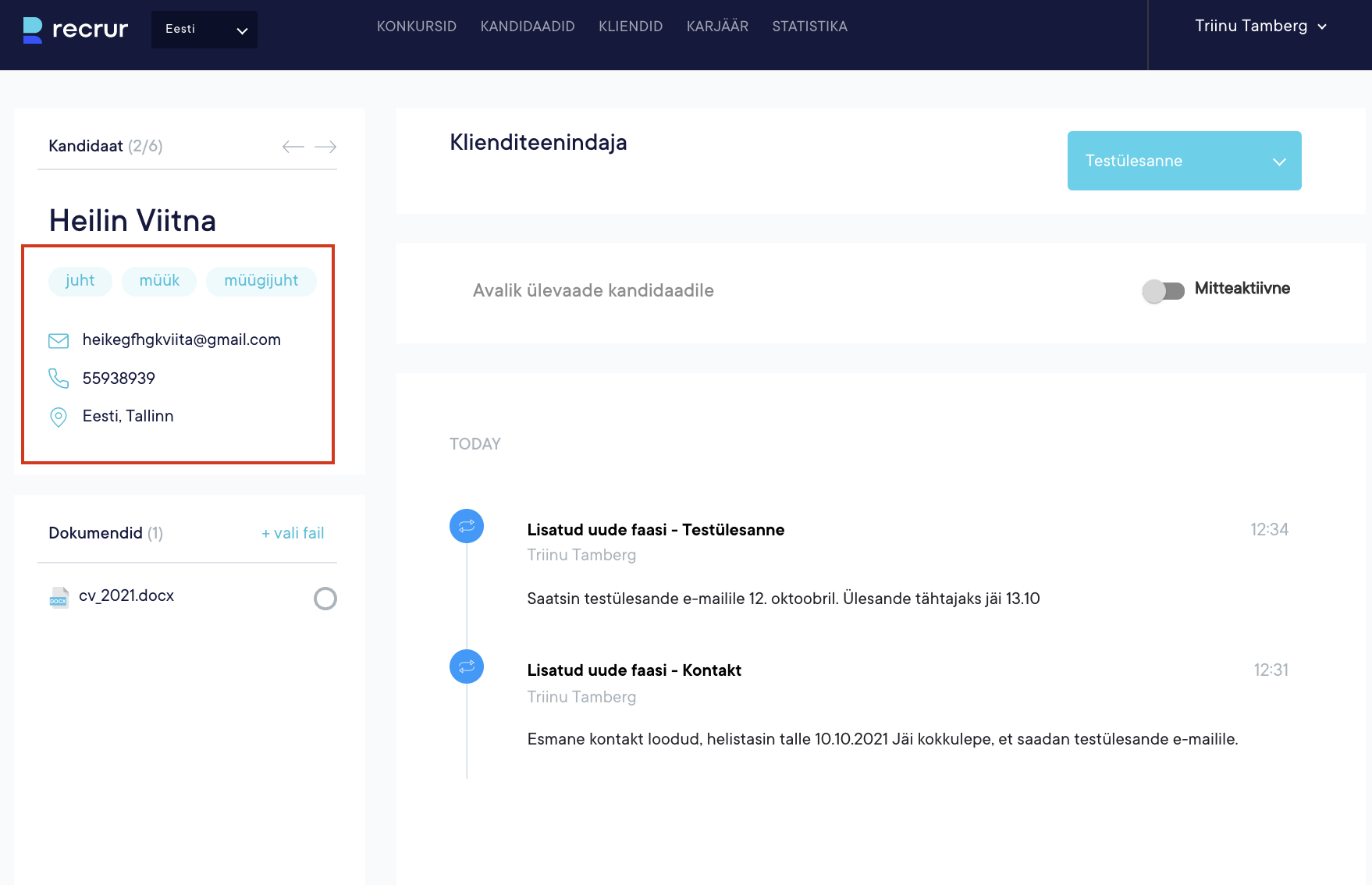 3. Näha kandidaadi kontaktinfot: e-posti aadressi, telefoninumbrit ja asu/elukohta. Samuti kandidaadi positsiooni/märksõnu kohe tema nime all:
