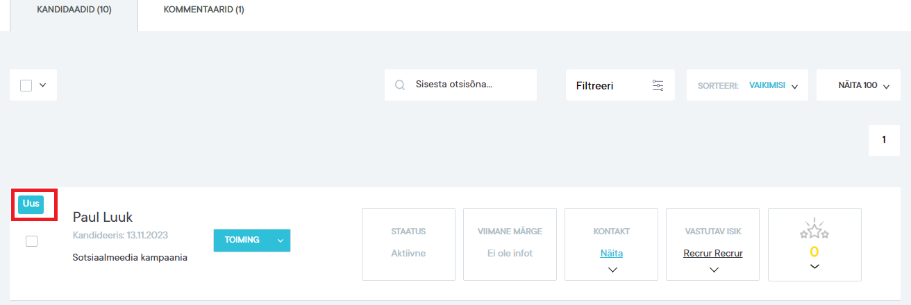 Meie silt uus on seotud kandidaadiga. Seega ei ole see konkursiga seotud ja teil ei saa olla selle kandidaadi jaoks ühe konkursi all Uus ja teise konkursi all ühtegi silti. Samuti, kui avate kandidaatide otsingu kaudu kandidaadi vaate, siis kaob ka Uus silt kõigi tööde alt.