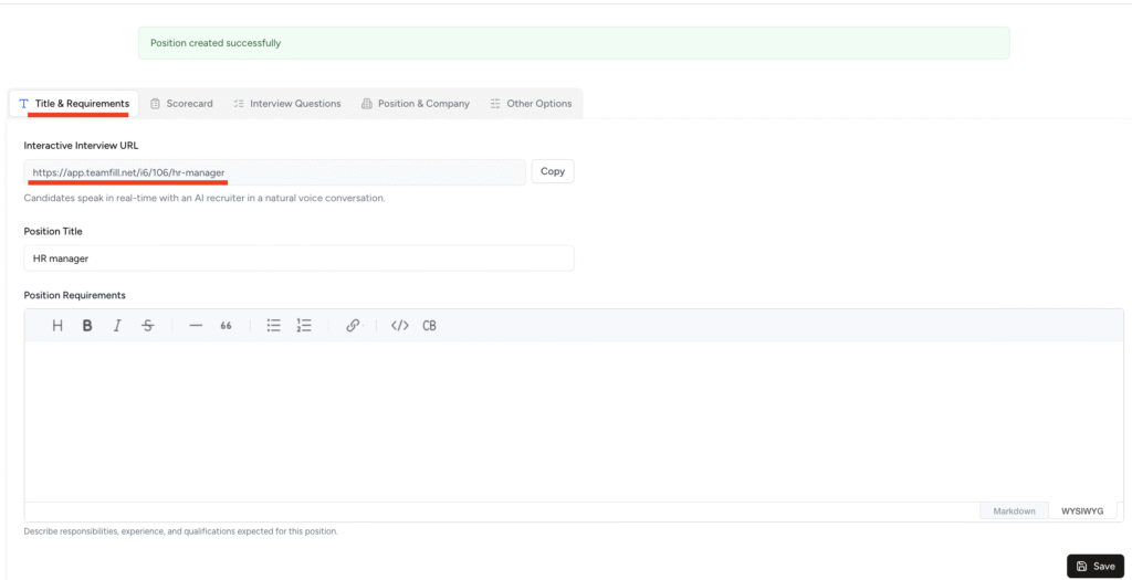 Mine sektsiooni Positions ja määra ametikoha nimetus. Kui lisad Position Requriements sektsiooni täpse kirjelduse ja nõuded kandidaadile hindab AI kandidaate vastavalt.