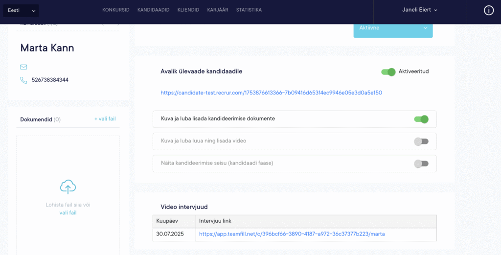 Kui kandidaat on video salvestanud näitab seda Recruris kandidaadi tegevuse vaates eraldi blokina: