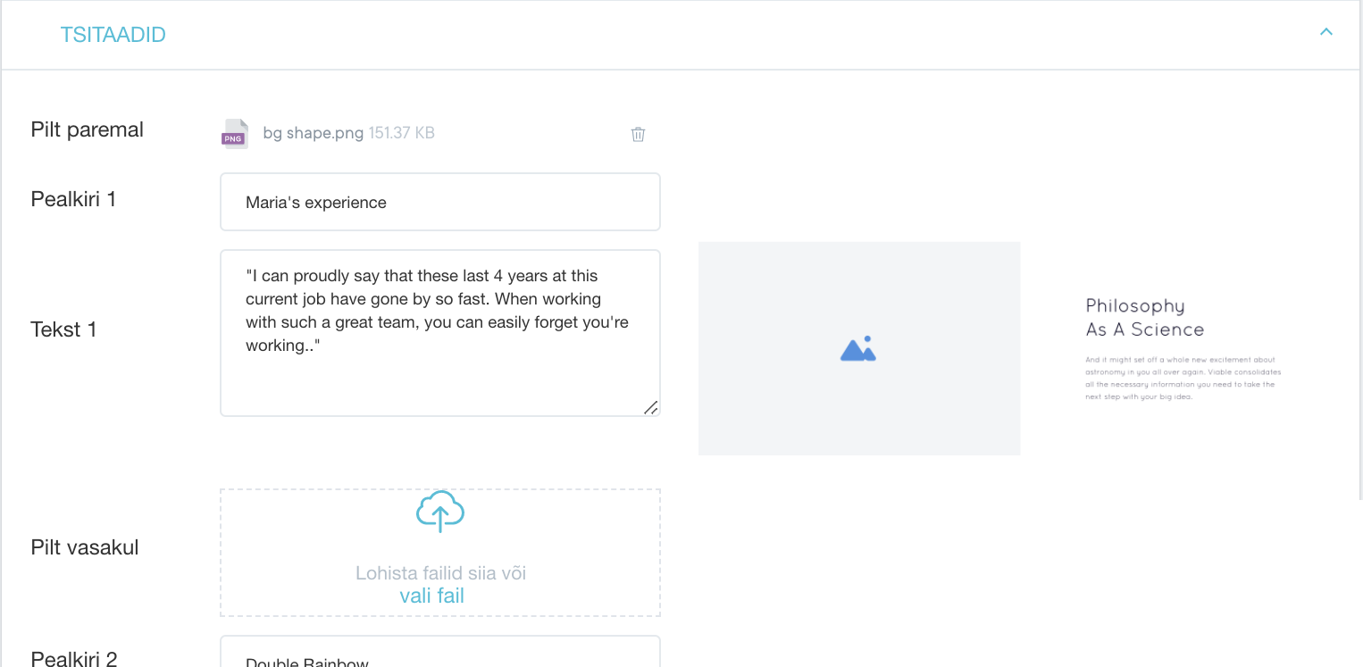 3.3 TSITAADID – võimalus lisada tsitaadid kolleegidelt või näiteks ettevõtte tegevjuhilt ning lisada juurde ka inimese vm pilt. Viimasesse plokki siin on võimalik lisada pildi asemel video.