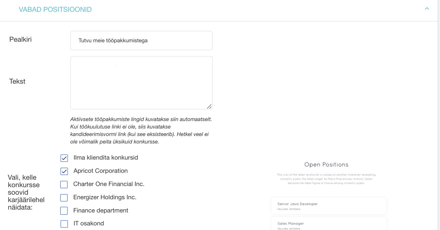 3.4 VABAD POSITSIOONID – Siia kuvatakse Recrurist automaatselt kõik aktiivsed tööpakkumised. Ehk – kõik ettevõtte aktiivsed töökuulutused on karjäärilehel välja toodud. Juhul, kui aktiivsel tööpakkumisel Recruris ei ole loodud töökuulutust, siis lisandub siia link kandideerimisvormile. Kui aga juhtub, et aktiivsel otsingul puudub nii töökuulutus kui ka kandideerimisvorm, siis antud töökoha otsingut karjäärilehele ei ilmu.