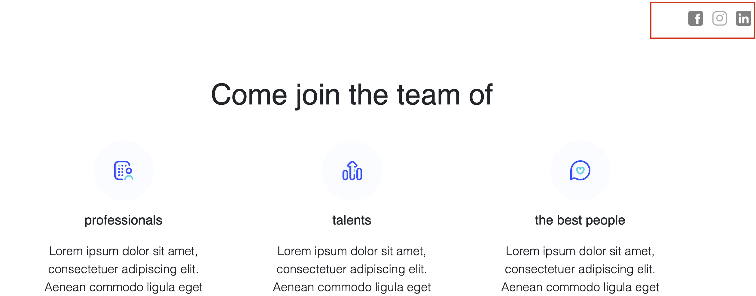 Veebilehel näeb lisatud Facebooki, Instagrami ja LinkedIni viide välja järgnev (paremal üleval nurgas):