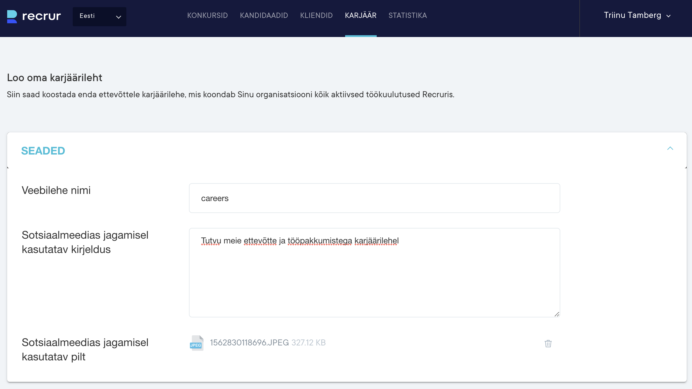 – Sotsiaalmeedias jagamine – siia lisa tutvustav tekst ja pilt (jpg või png formaadis), mida karjäärilehte sotsiaalmeedias jagades kuvatakse. Ära unusta infot ka salvestada!