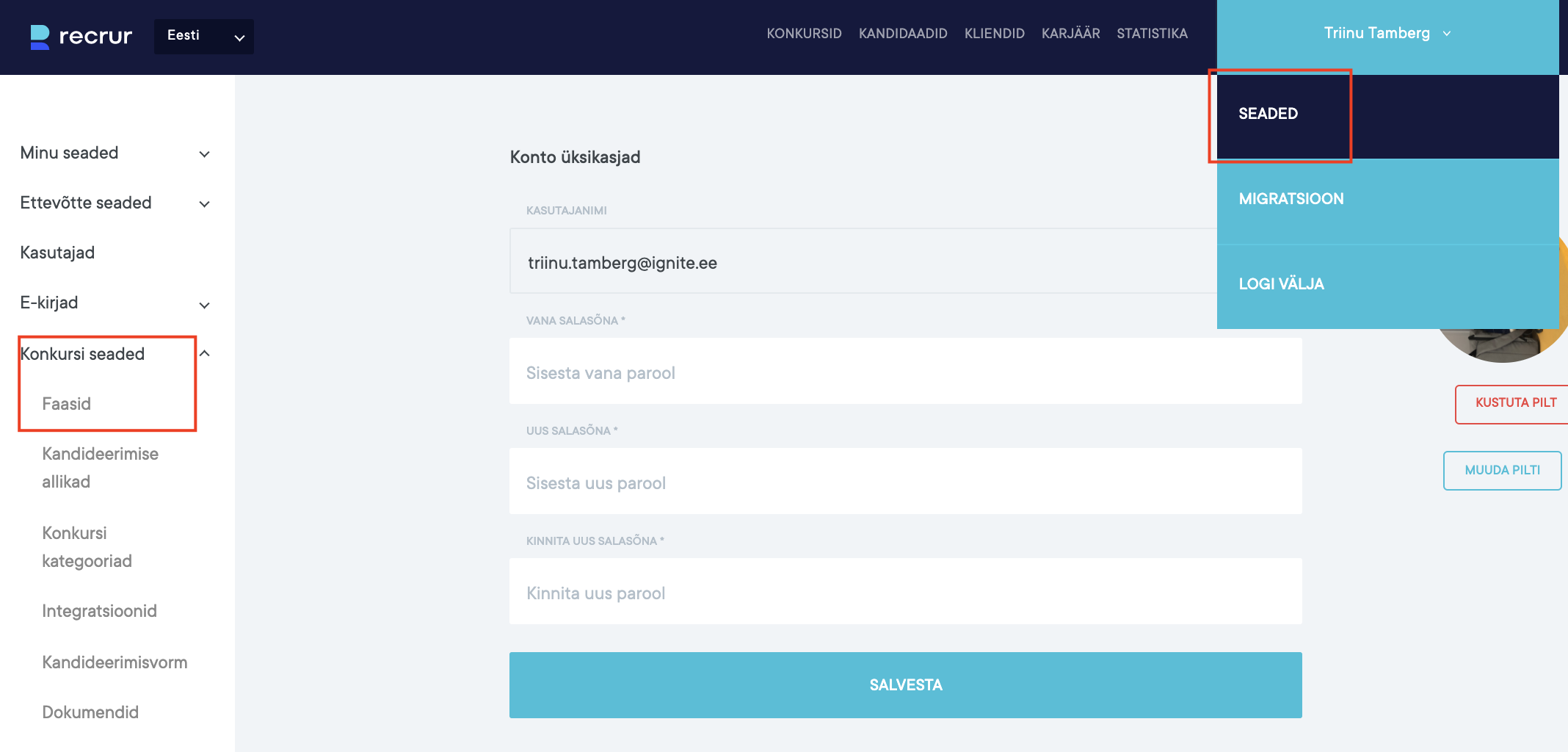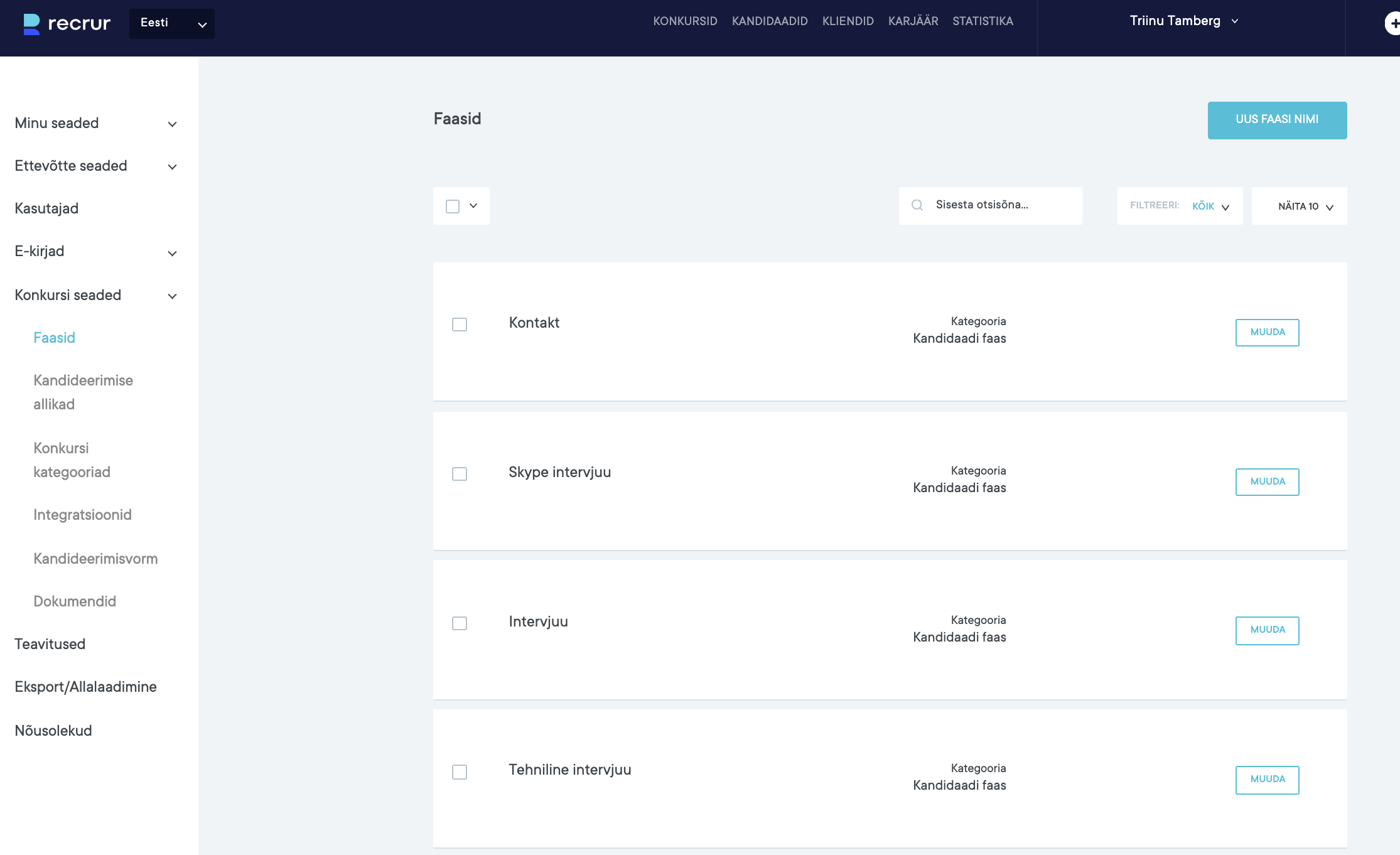 2. “Konkursi seaded” alt vali “Faasid”. Selles vaates on koos nii kandidaadi faasid kui ka konkursi faasid.