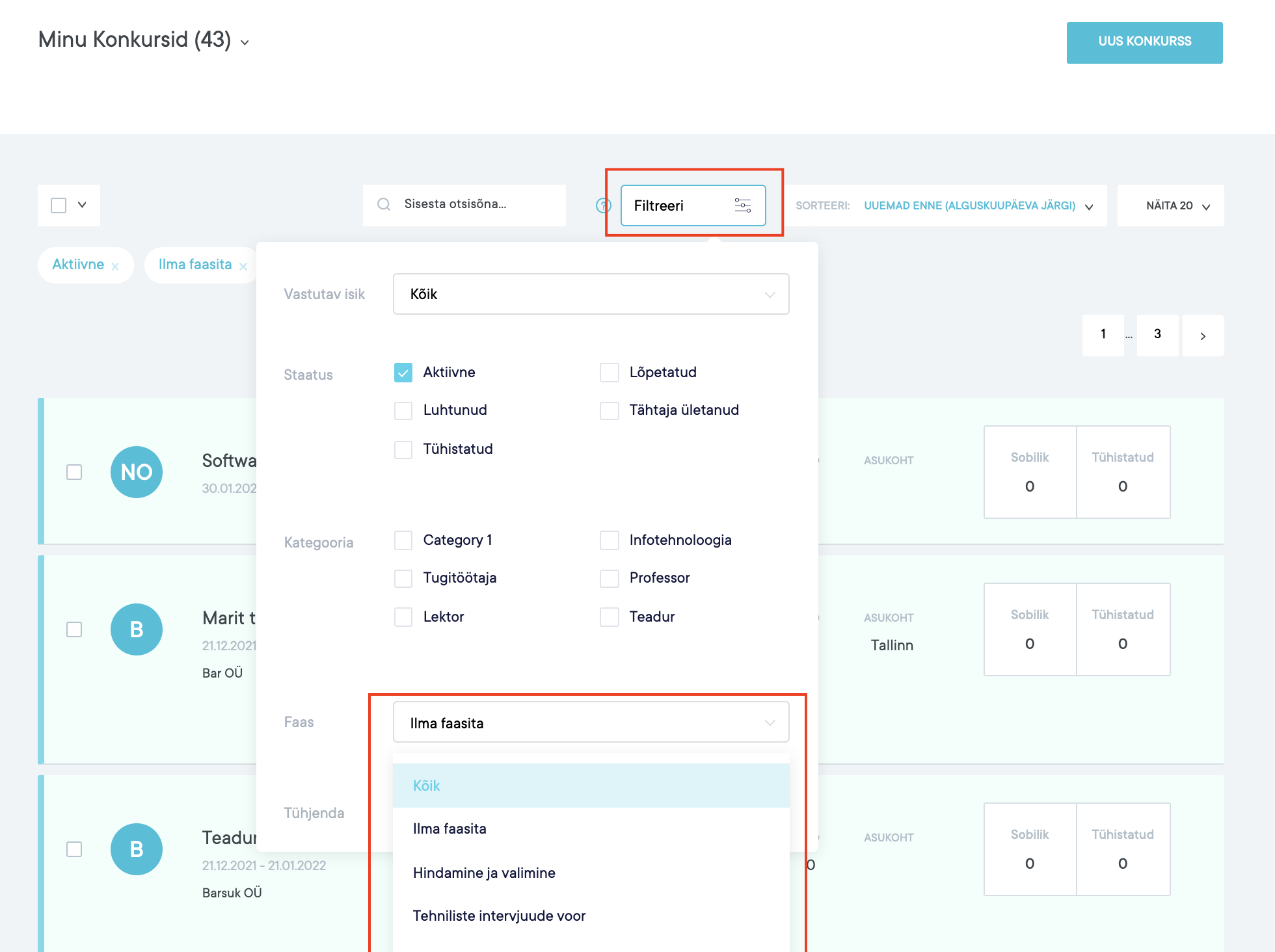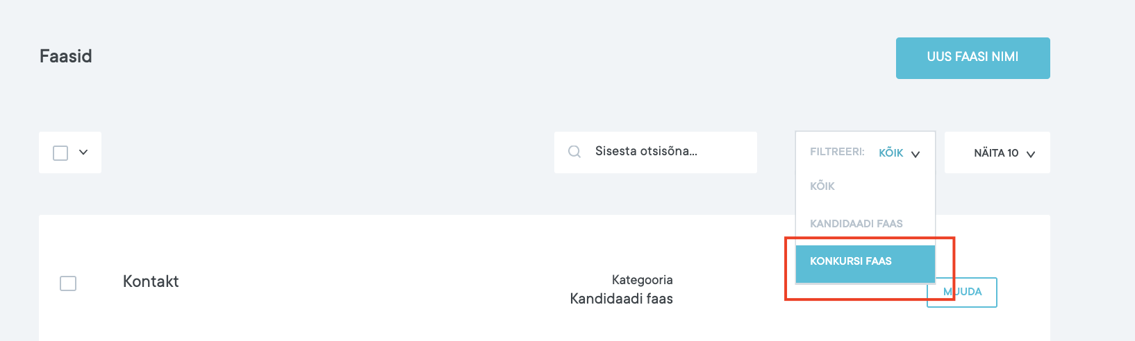 Faaside abil saad mugavalt oma konkursside loetelus filtreerida välja just soovitud faasis konkursid. Näiteks alljärgneval pildil on valitud kuvamiseks kõik konkursid, millele veel ei ole faasi lisatud: