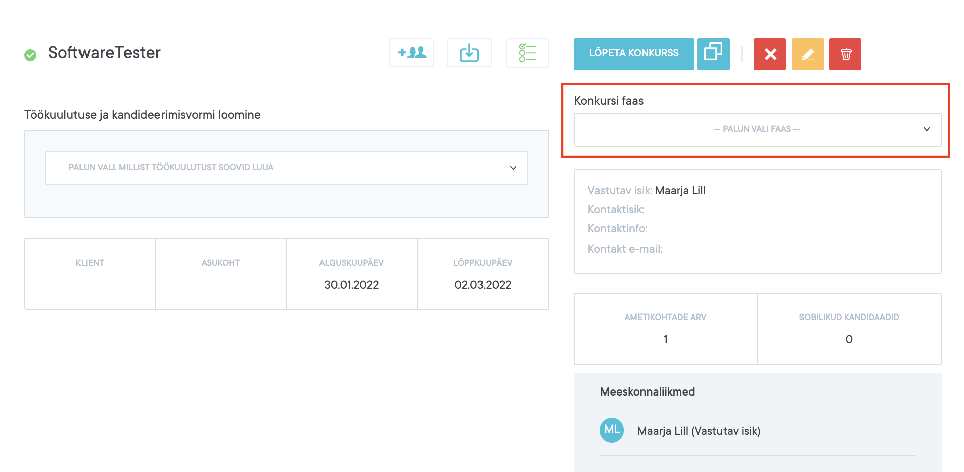 Selleks, et saaks paremini aimu, millises seisus teatud konkurss on, on kasutusel konkursi faas. Näiteks saad selle abil määrata, et konkurss on alles “Koostamisel” või hoopis juba “Kandideerimine lõppenud” vm faasis.
