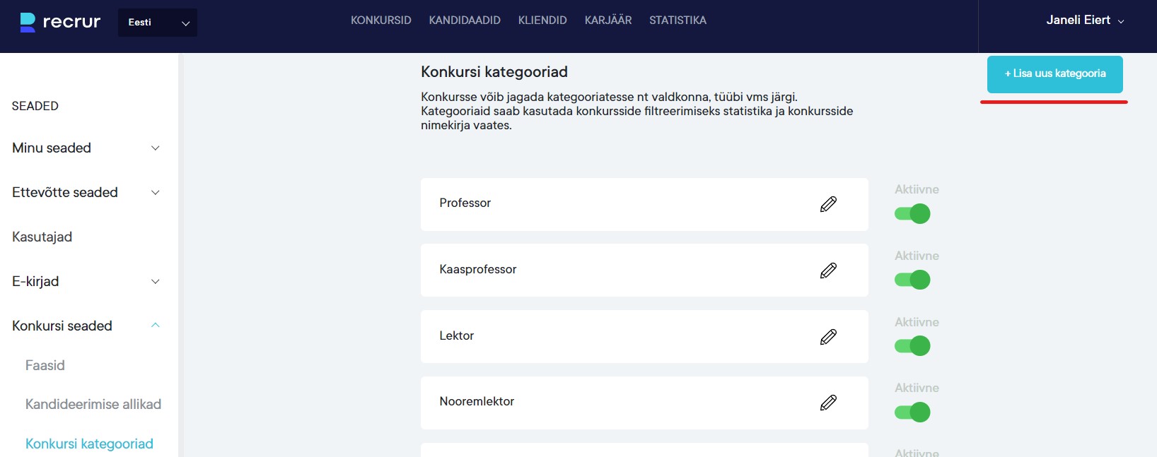 Kategooriate funktsionaalsus võimaldab igal organisatsioonil luua kategooriaid, mille järgi konkursse soovite eristada. Konkursse võib jagada kategooriatesse nt valdkonna, tüübi, asukoha vms järgi. Kategooriaid saab lisada järgnevalt: seaded – konkursi seaded – konkursi kategooriad – lisa uus kategooria.