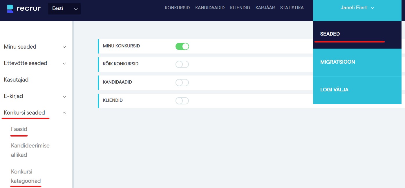 Faaside ja kategooriate põhjal saab  konkurssi mugavalt grupeerida/kategoriseerida. Selleks, et need lisada tuleb liikuda seadete alla ning seejärel valida konkursi seaded.