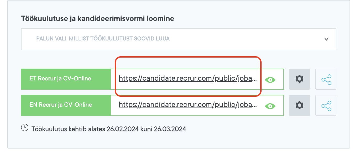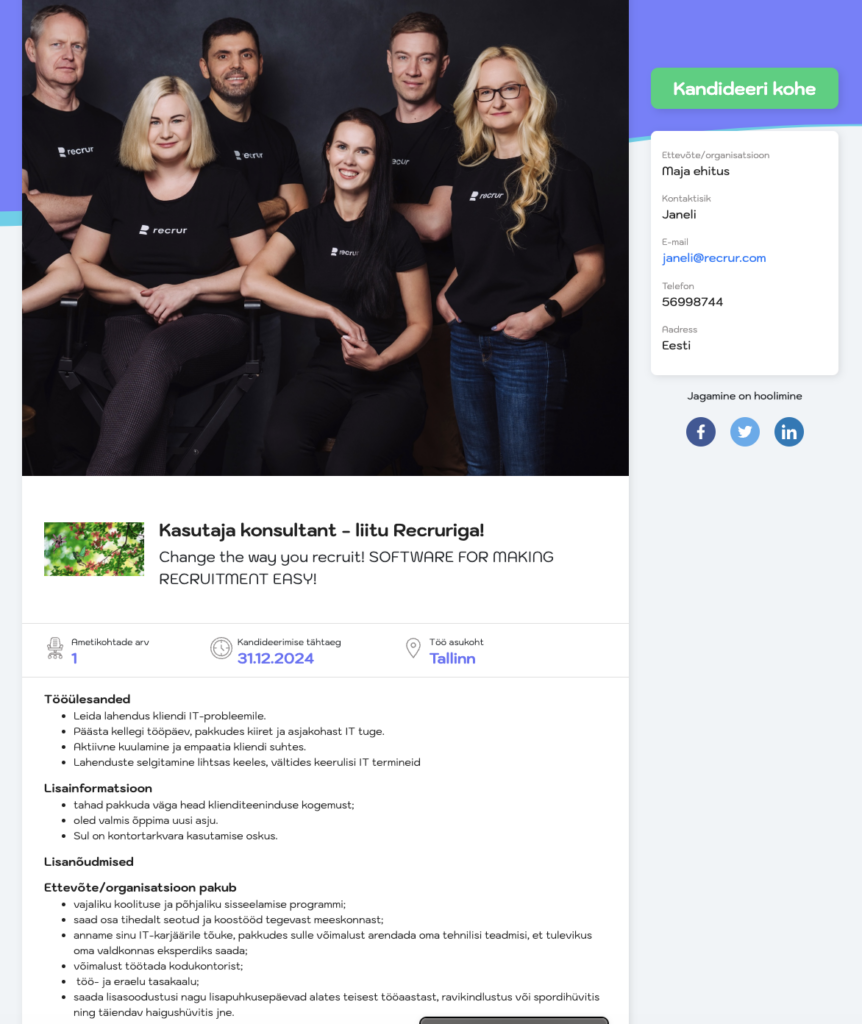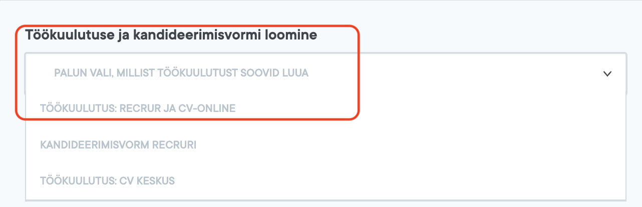 Töökuulutusega soovitame luua kandideerimisvormi. See annab võimaluse kandidaadil kohe Recruri vormil kandideerida mistahes kanalist kandidaat töökuulutuse leiab ja andmed tulevad otse Recruri.