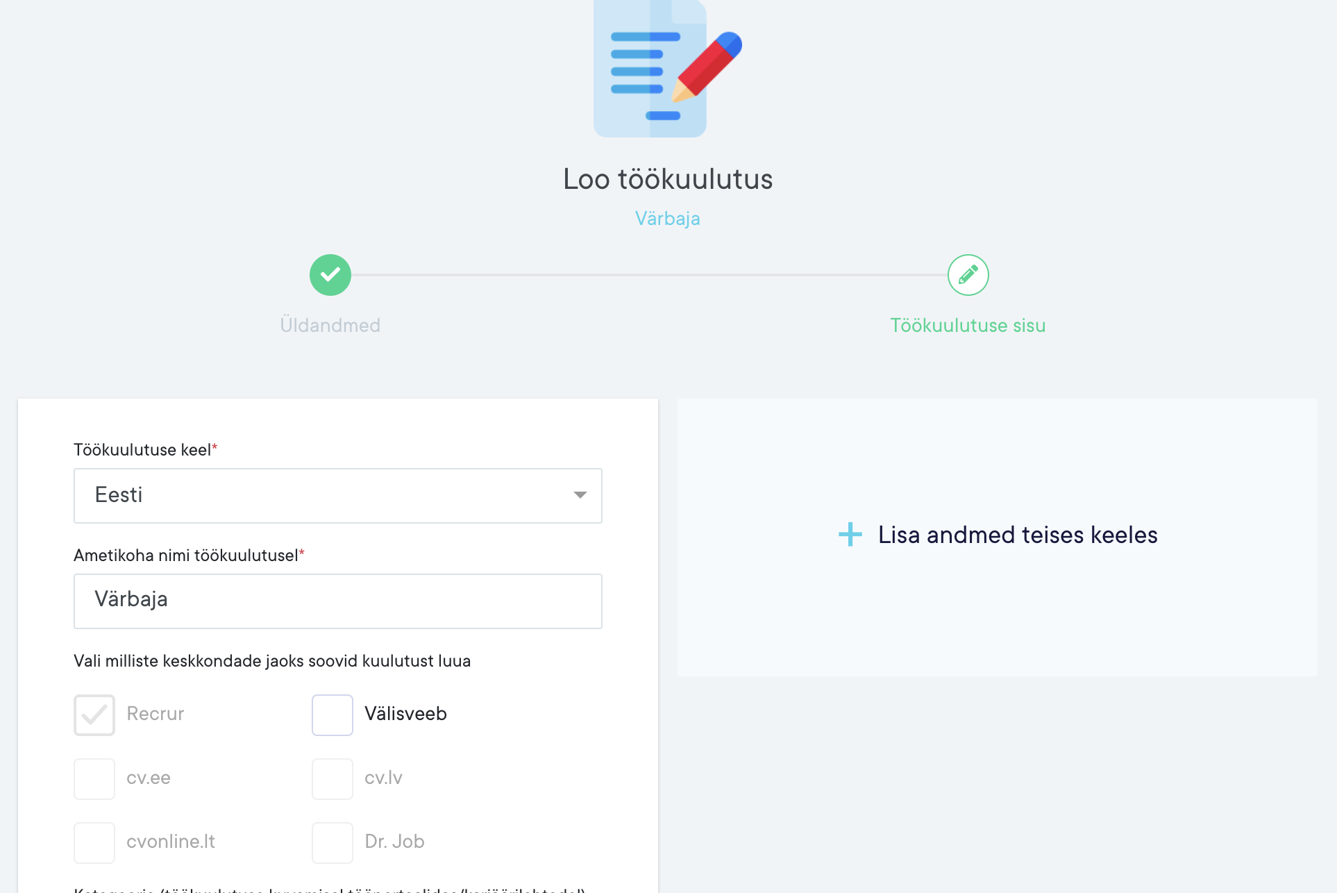 Edasistes valikutes saab hakata sisestama töökuulutuse teksti. Kui lood kuulutust kahes keeles siis Recrur automaatset tõlget ei paku ja kuulutuse sisu tuleb endal ümber tõlkida ja sisestada.