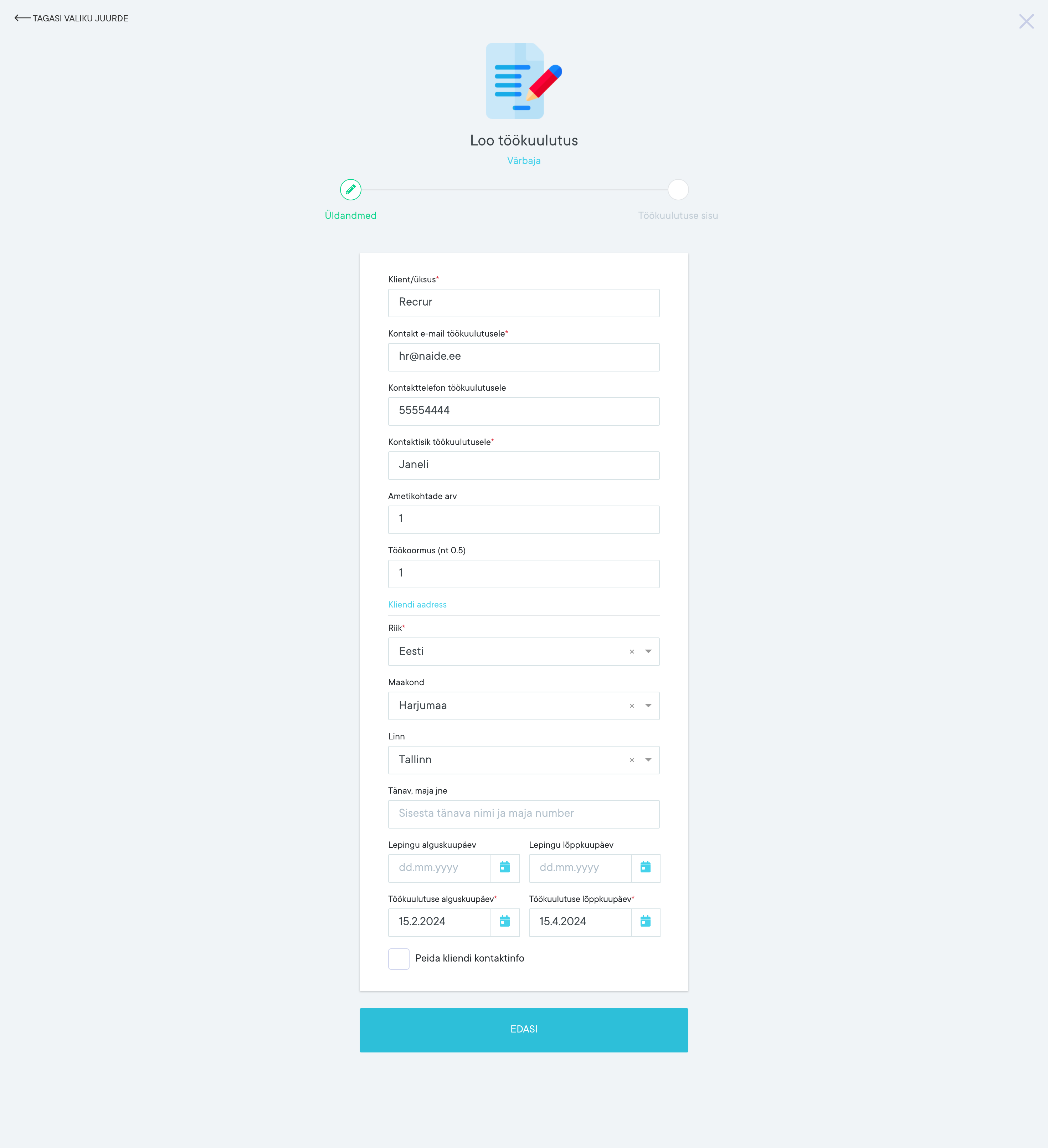 Kui üldinfo on sisestatud siis vajuta Edasi ning saad hakata täitma töökuulutuse vormi.