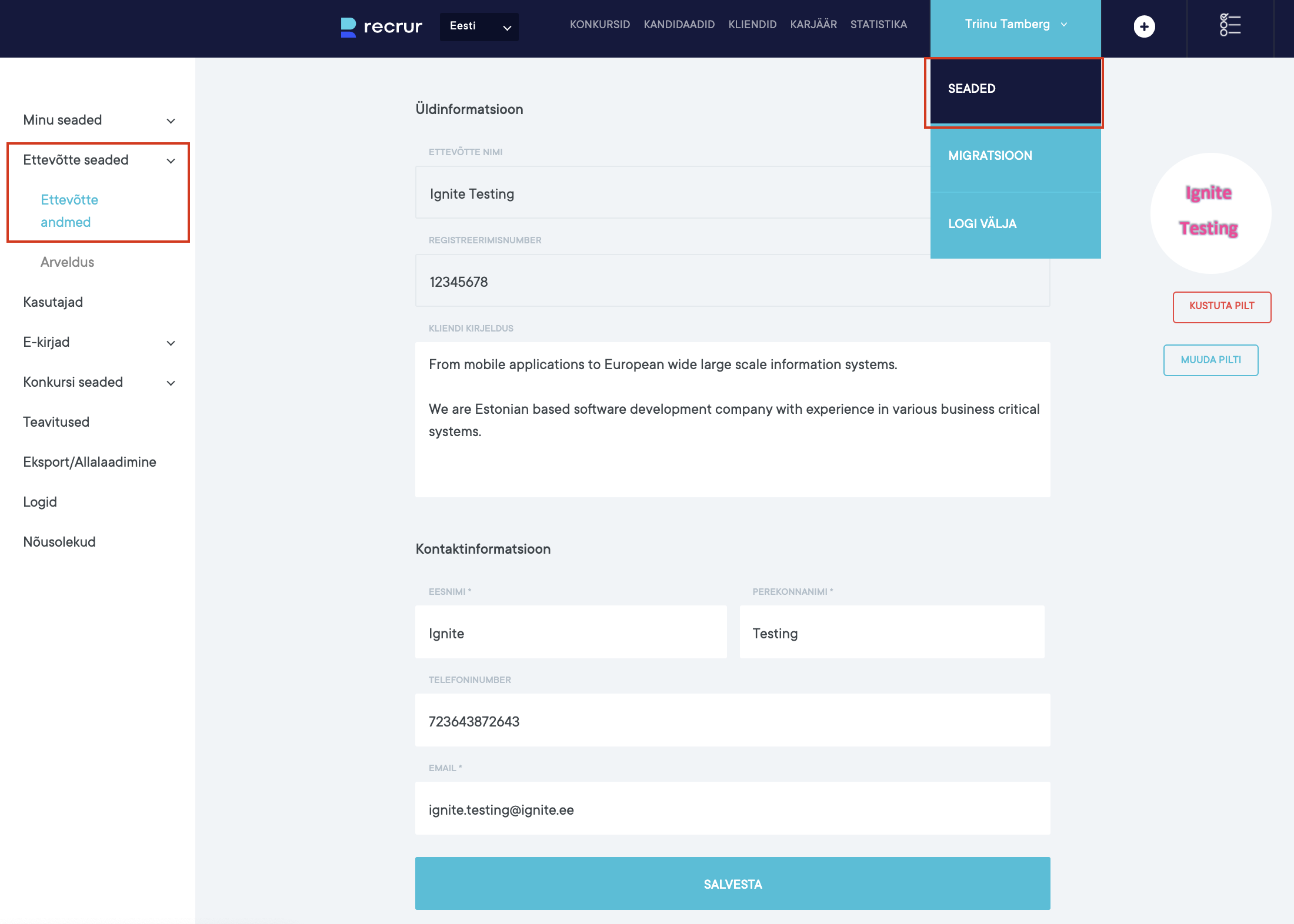“Ettevõtte nimi” ja “registreerimisnumber” väljad ei ole muudetavad – see info määratakse juba konto loomisel.