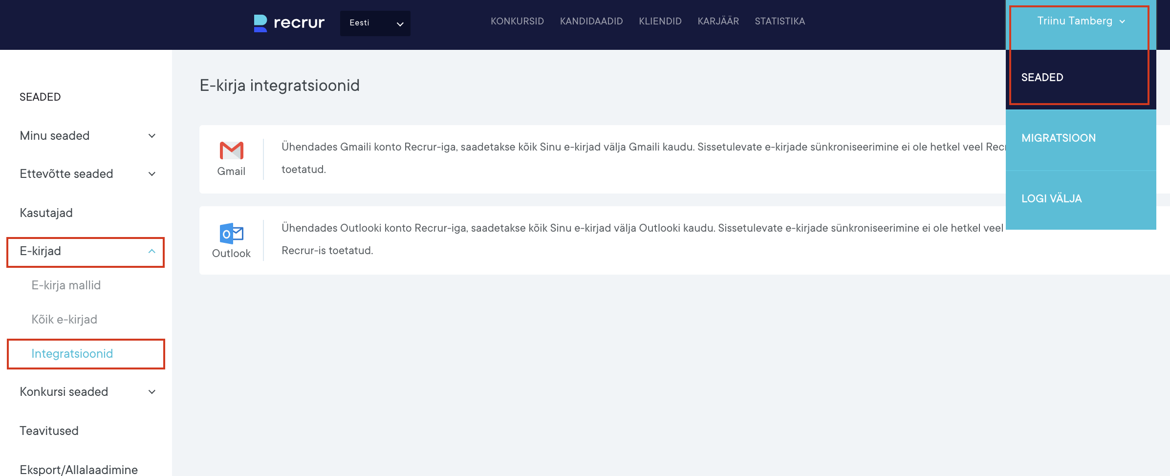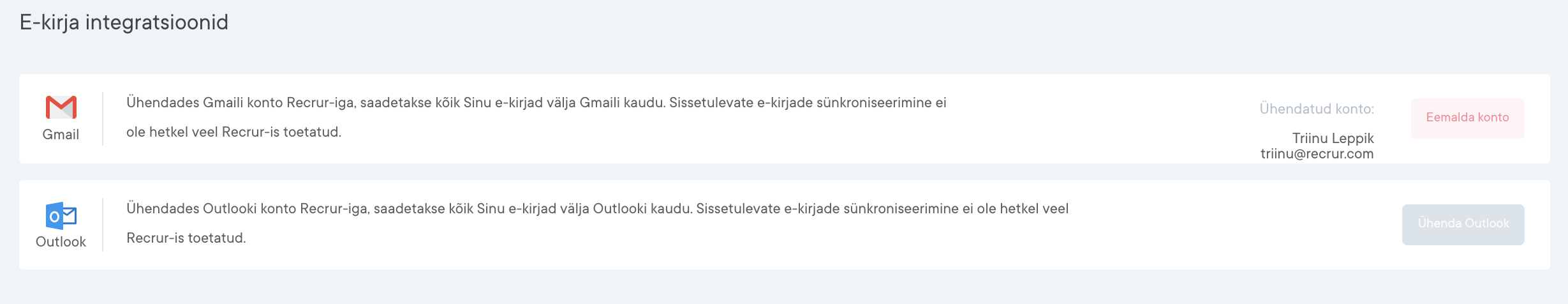 E-maili integratsioonide abil on võimalik siduda Sinu Gmaili või Outlooki kasutaja Recruriga. See tähendab, et kõik Sinu poolt Recrurist saadetud e-kirjad saadetakse välja Sinu Gmaili/Outlooki meiliaadressi nimel (ehk saatja aadressina näitab seda konkreetset Sinu isiklikku ühendatud aadressi, vastasel juhul on saatjaks “no-reply@recrur.com”).