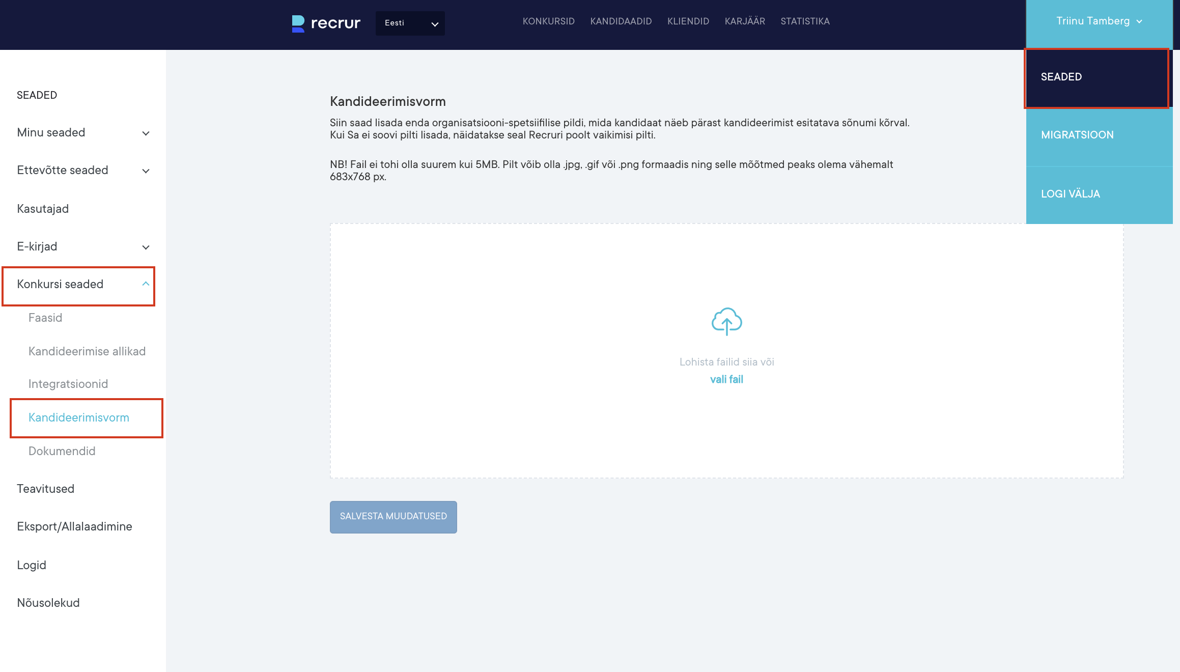 Selleks tuleb Recruris minna Seaded -> Konkursi seaded -> Kandideerimisvorm: