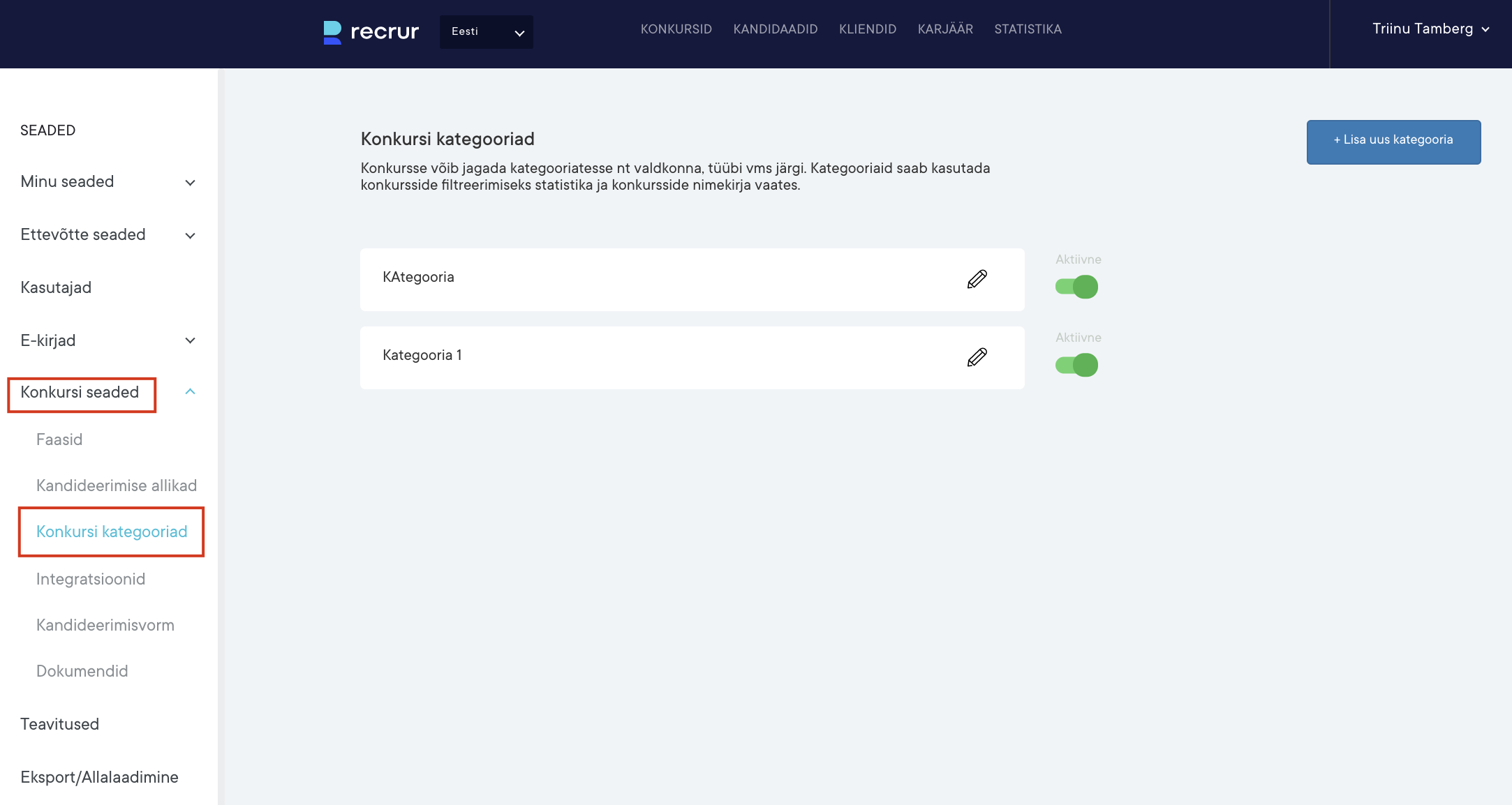 Konkursi kategooriaid saab luua ja muuta seadete all:
