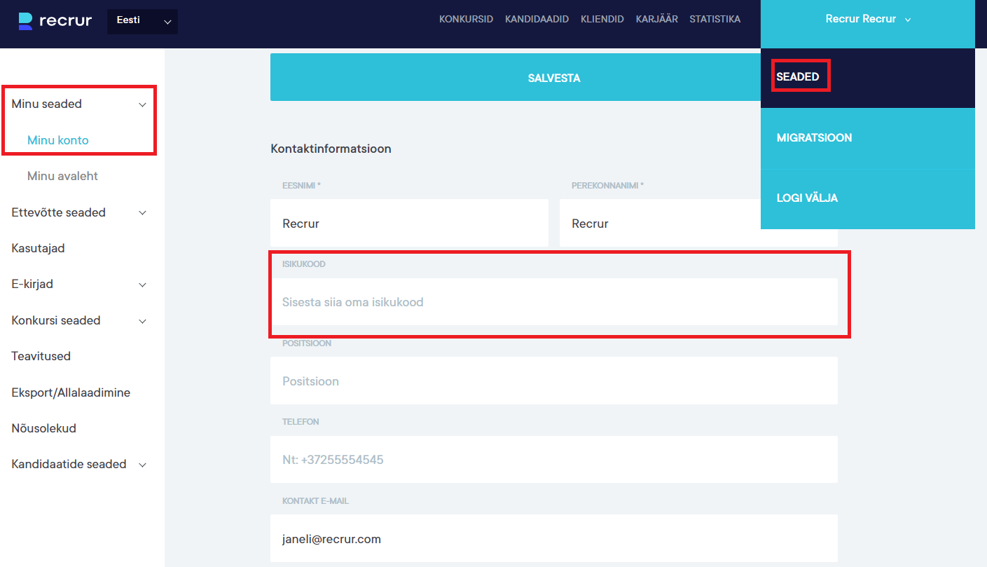 Selle kasutamise järgmiseks eelduseks on, et Sinul kui Recruri kasutajal on sisestatud Recruris enda isikukood. Seda saab sisestada seadete all: