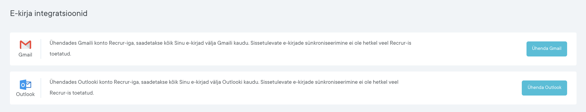E-maili integratsioonide abil on võimalik siduda Sinu Gmaili või Outlooki kasutaja Recruriga. See tähendab, et kõik Sinu poolt Recrurist saadetud e-kirjad saadetakse välja Sinu Gmaili/Outlooki meiliaadressi nimel (ehk saatja aadressina näitab seda konkreetset Sinu isiklikku ühendatud aadressi, vastasel juhul on saatjaks “no-reply@recrur.com”).