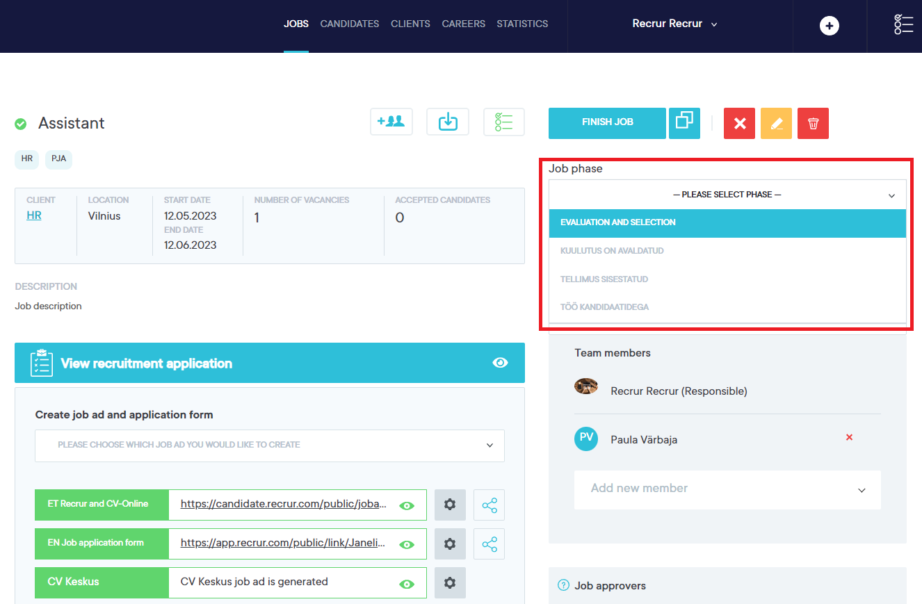 This means that within the job where the Evaluation and selection phase has been selected, only those users who have been granted the appropriate rights can see the job. Other users cannot access the competition even if they are marked as members of the job team! The job and candidates can only be seen by those users who have been added as either an evaluator or a viewer!