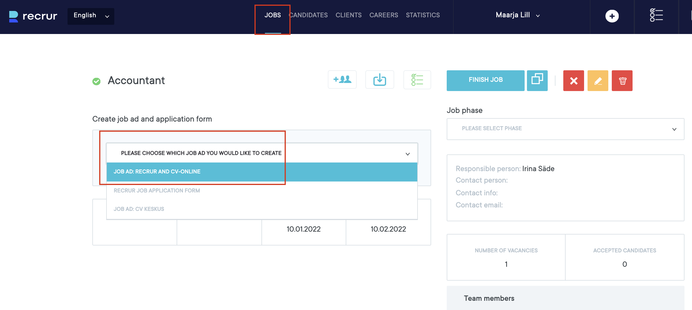 3. If it is ready, you just need to go to the job profile and select: “Job ad: Recrur and CVOnline”