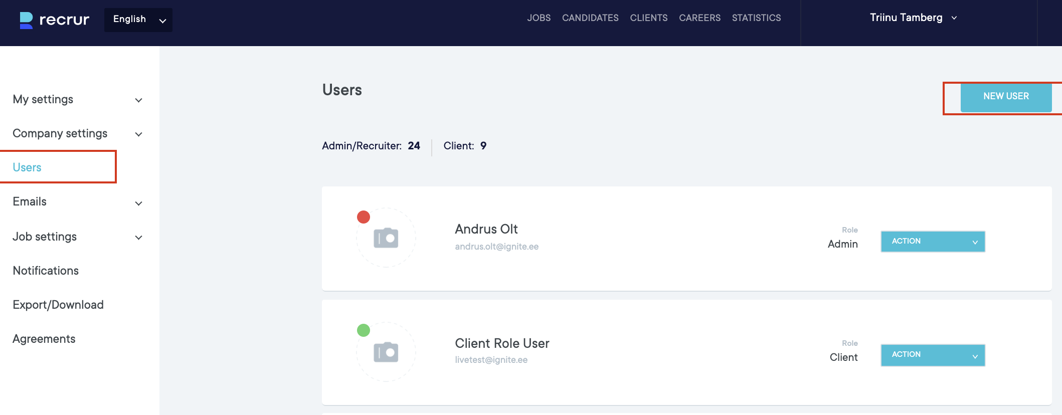 Whether you want to add a new admin, recruiter or a client-role user, you need to follow these steps: