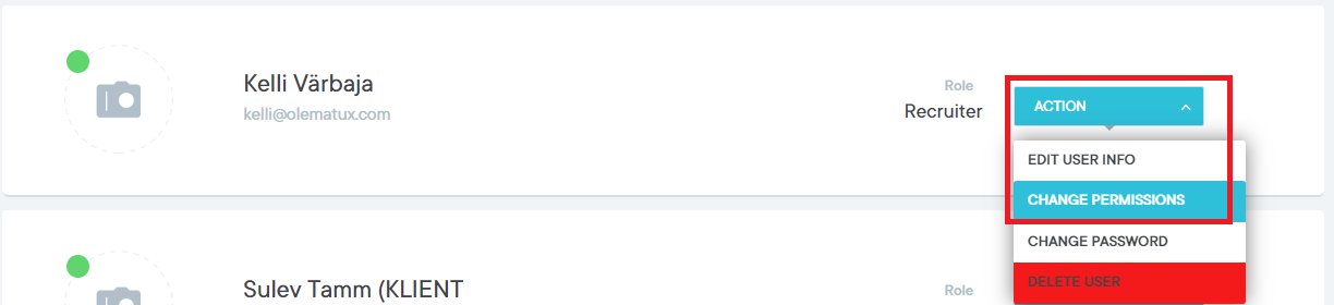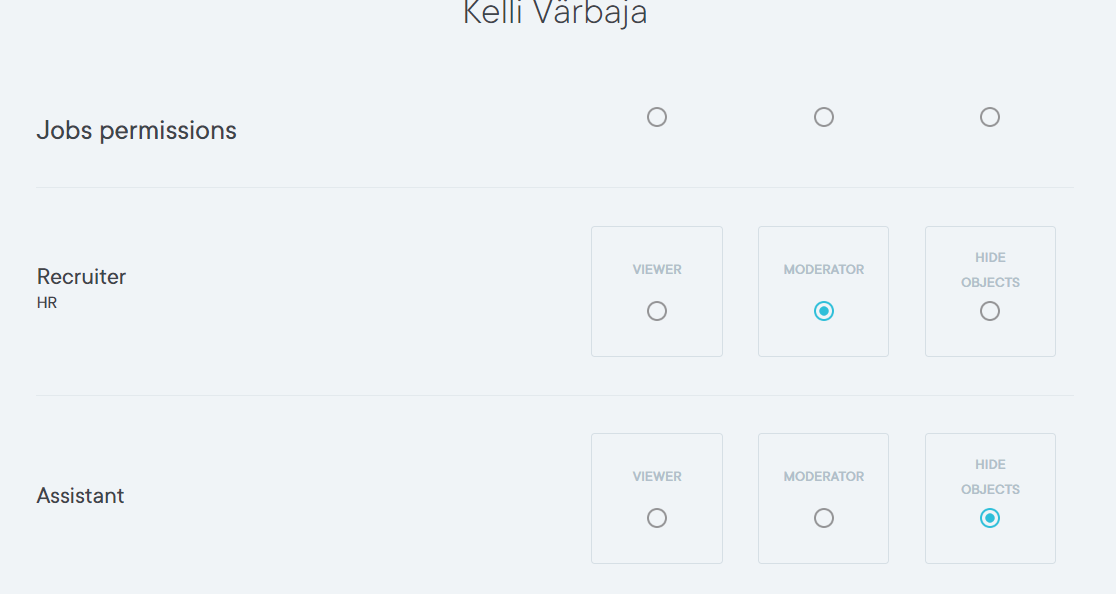 – The right to change (MODERATOR): The right to see the job profile and list of candidates. It is possible to add phases to candidates, see the candidate’s activity view, etc.