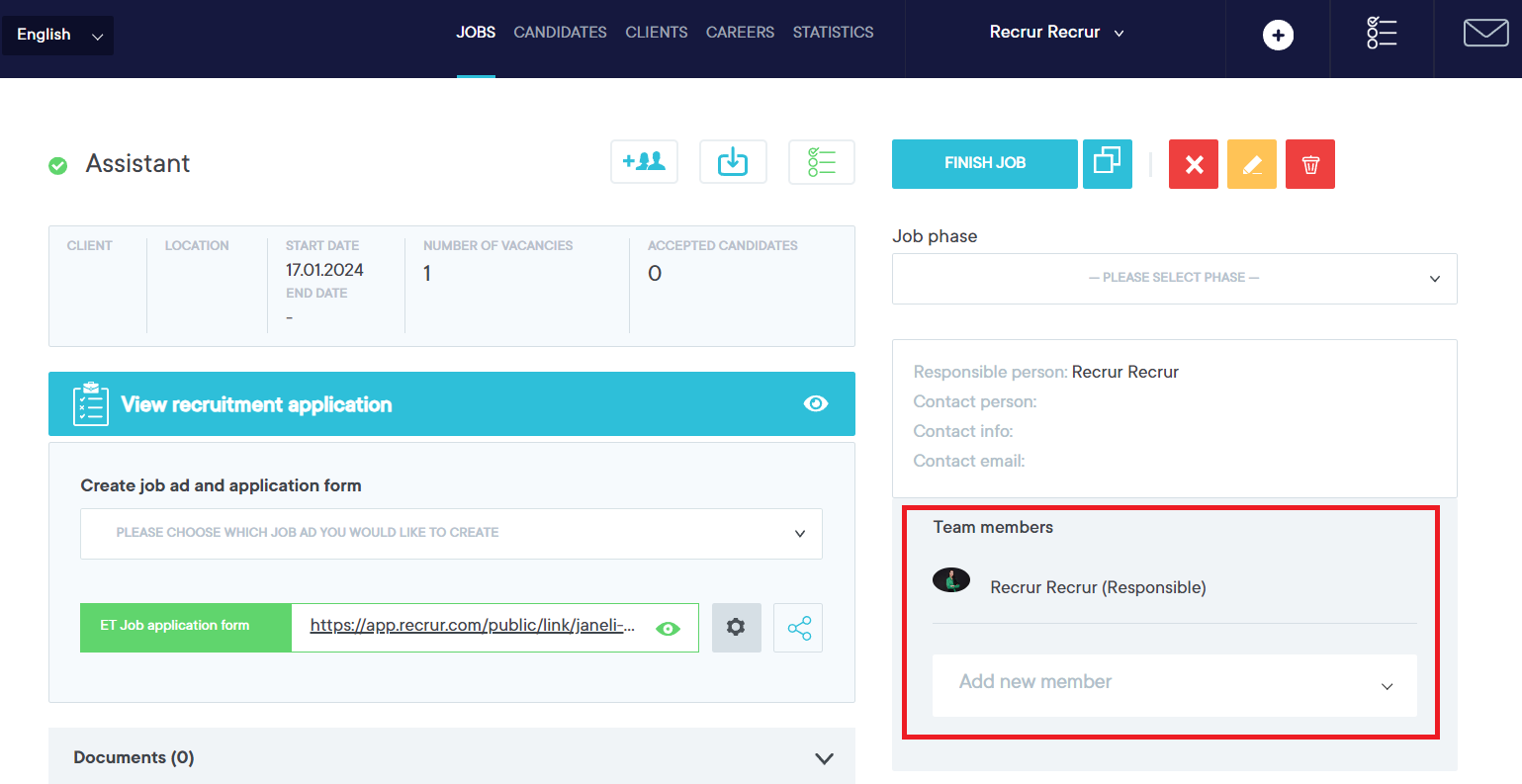 – Right to view (VIEWER): The right to see the profile of the job and its list of candidates. There is no right to add phases to candidates and make changes to candidates.