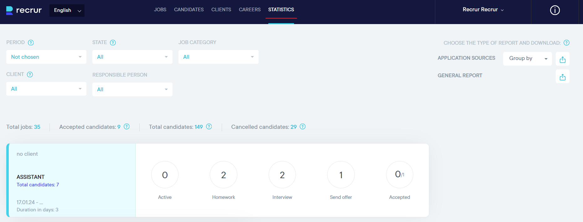 Depending on the job, each recruitment is divided into phases (in other words, within each job you have used a certain selection/amount of phase), and you can also see the statistics and placement of candidates in different phase in the following example of the “ASSISTANT” job:
