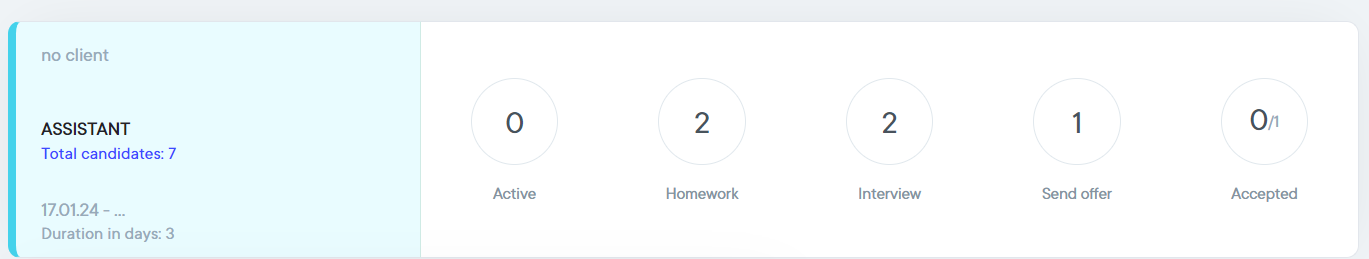 • Candidates have been in different phases (Active, Homework, Interview, Send offer, Accepted), in which there are currently a total of 7 candidates.